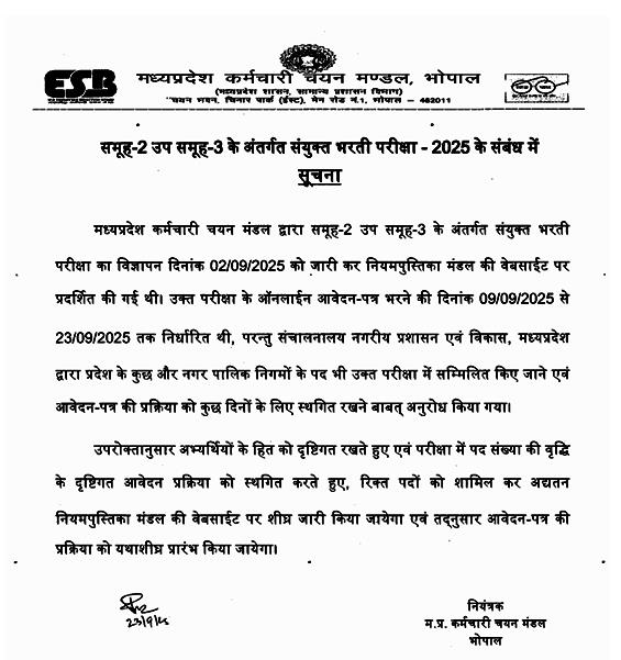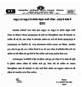 समूह-3 उपयंत्री, मानचित्रकार, समयपाल एवं समकक्ष पदों की भर्ती एवं बैकलोग भर्ती हेतु संयुक्त भर्ती परीक्षा - 2022 की परीक्षा तिथि में वृद्धि करते हुए परीक्षा के आयोजन की प्रारंभ तिथि 06 नवंबर 2022 से निर्धारित की जाती है| परीक्षा की अन्य सभी शर्ते पूर्व अनुसार यथावत रहेगी|