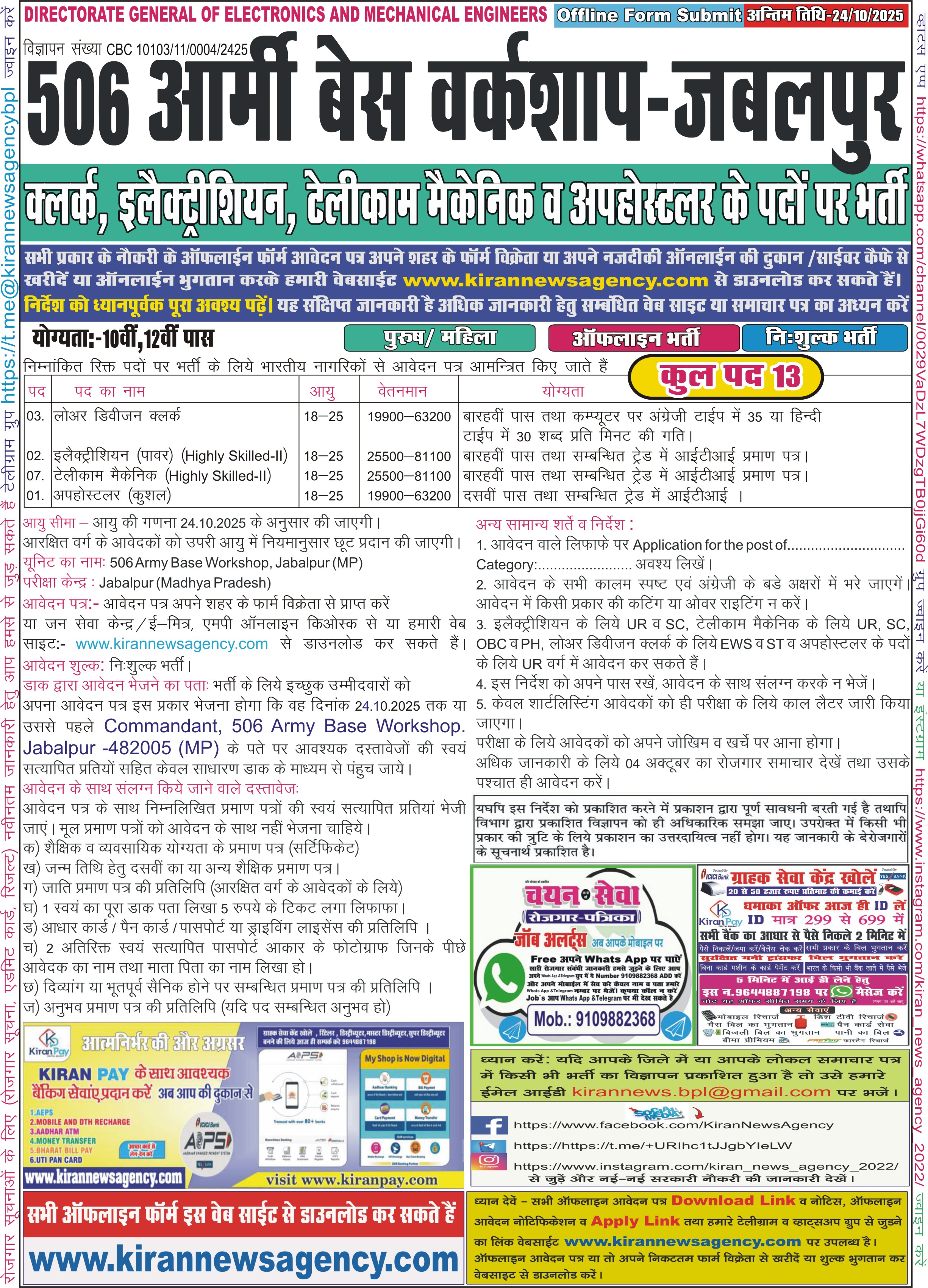 Recruitment :- Clerk, Electrician, Telecom Mechanic, Uphostler