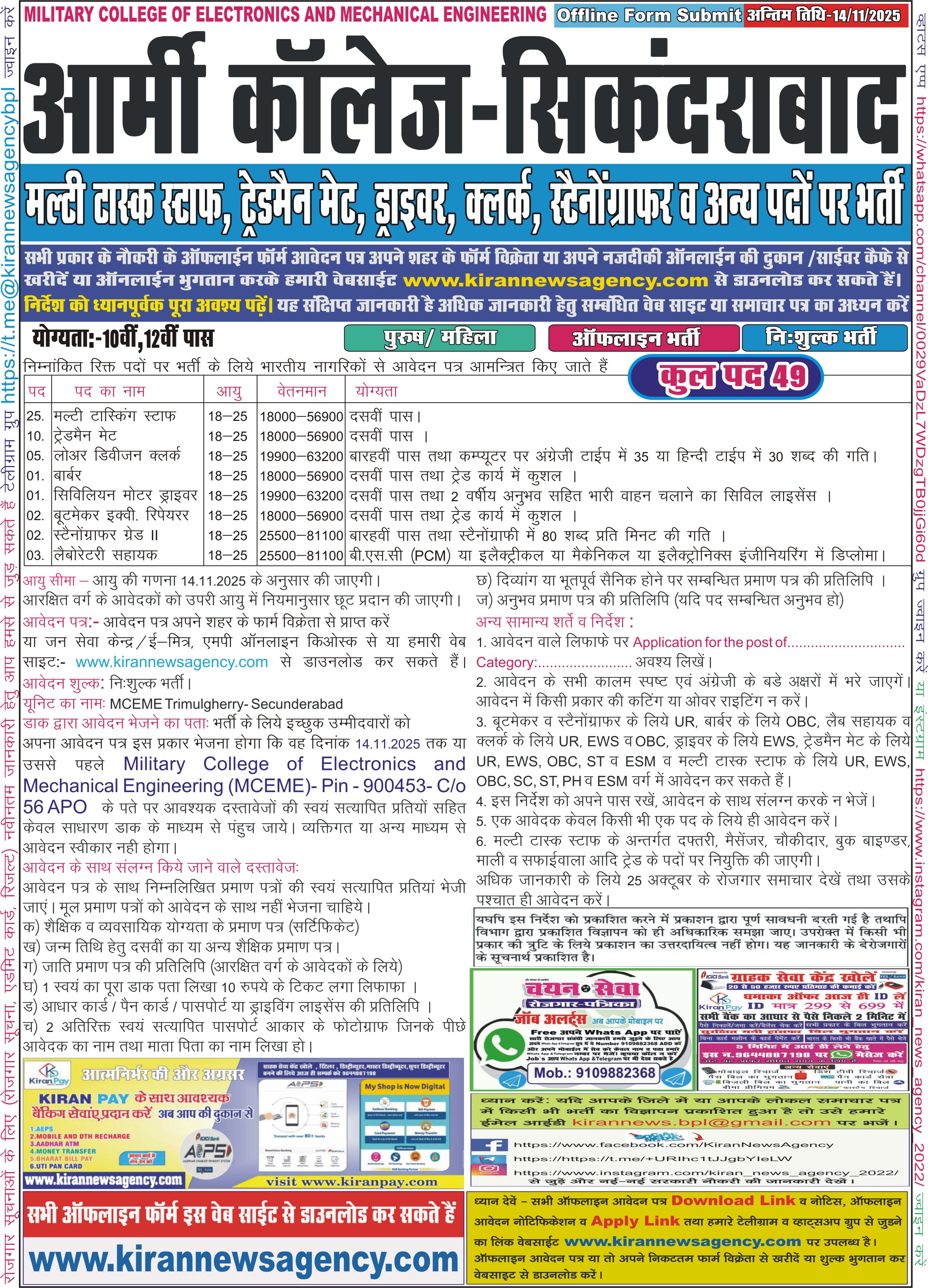 Recruitment :- Multi Task Staff, LDC, Trademan Mate, Stenographer, Driver, Lab Assistant, Barber, Bootmaker ER