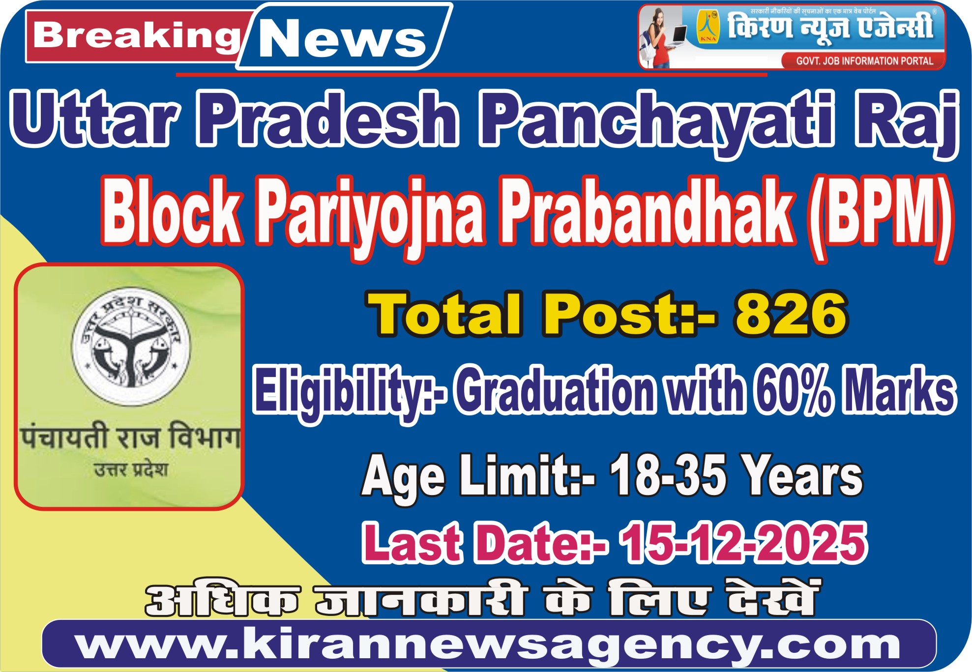 UP Panchayati Raj BPM Recruitment 2025 : Vacancy Details Total 826 Post| Post Name | Total Post | UP Panchayati Raj BPM Eligibility 2025 | | Block Pariyojna Prabandhak (BPM | 826 | - Graduation Degree in Any Stream with 60% Marks