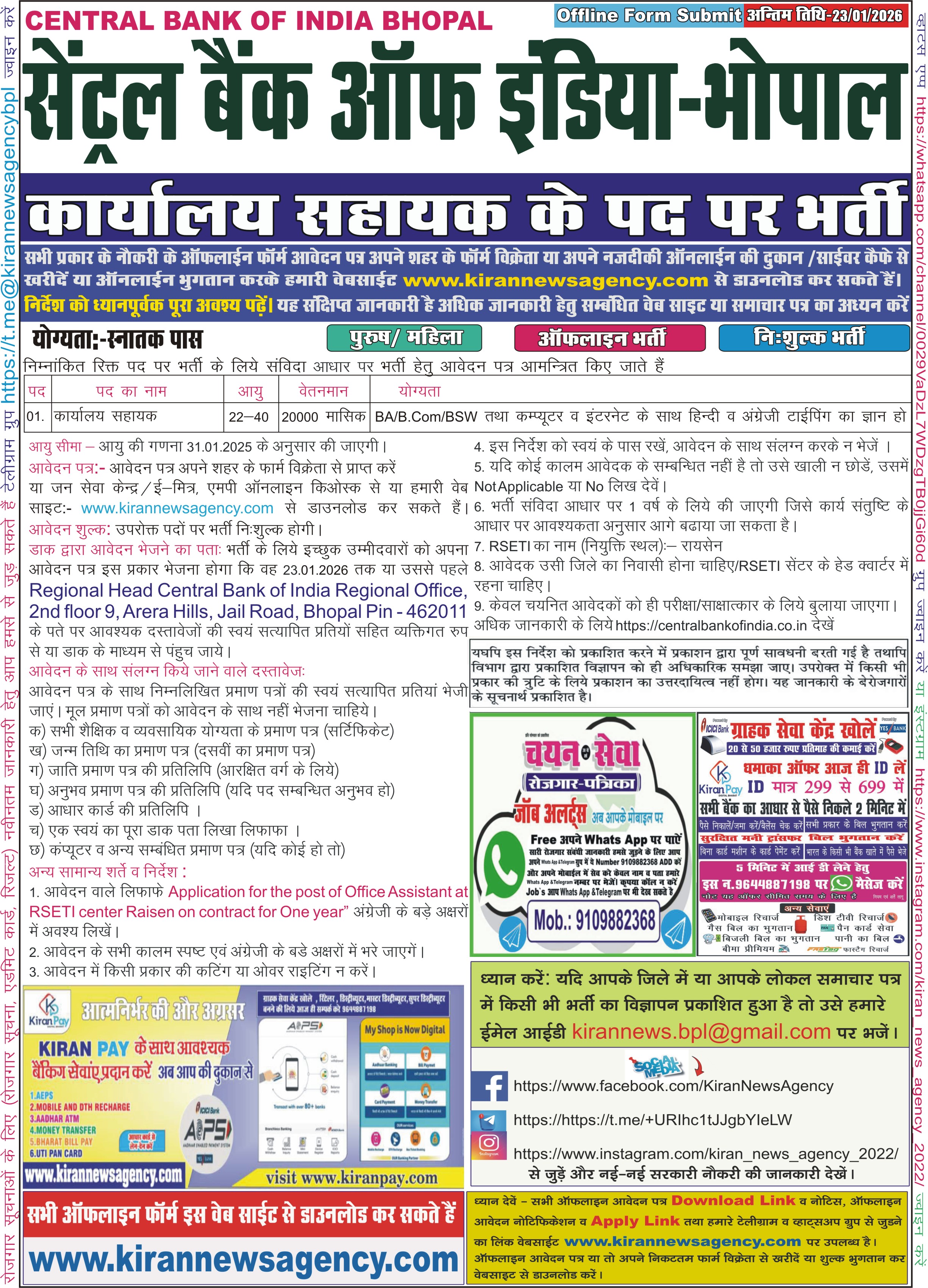 Central Bank of India, Bhopal Office Assistant |