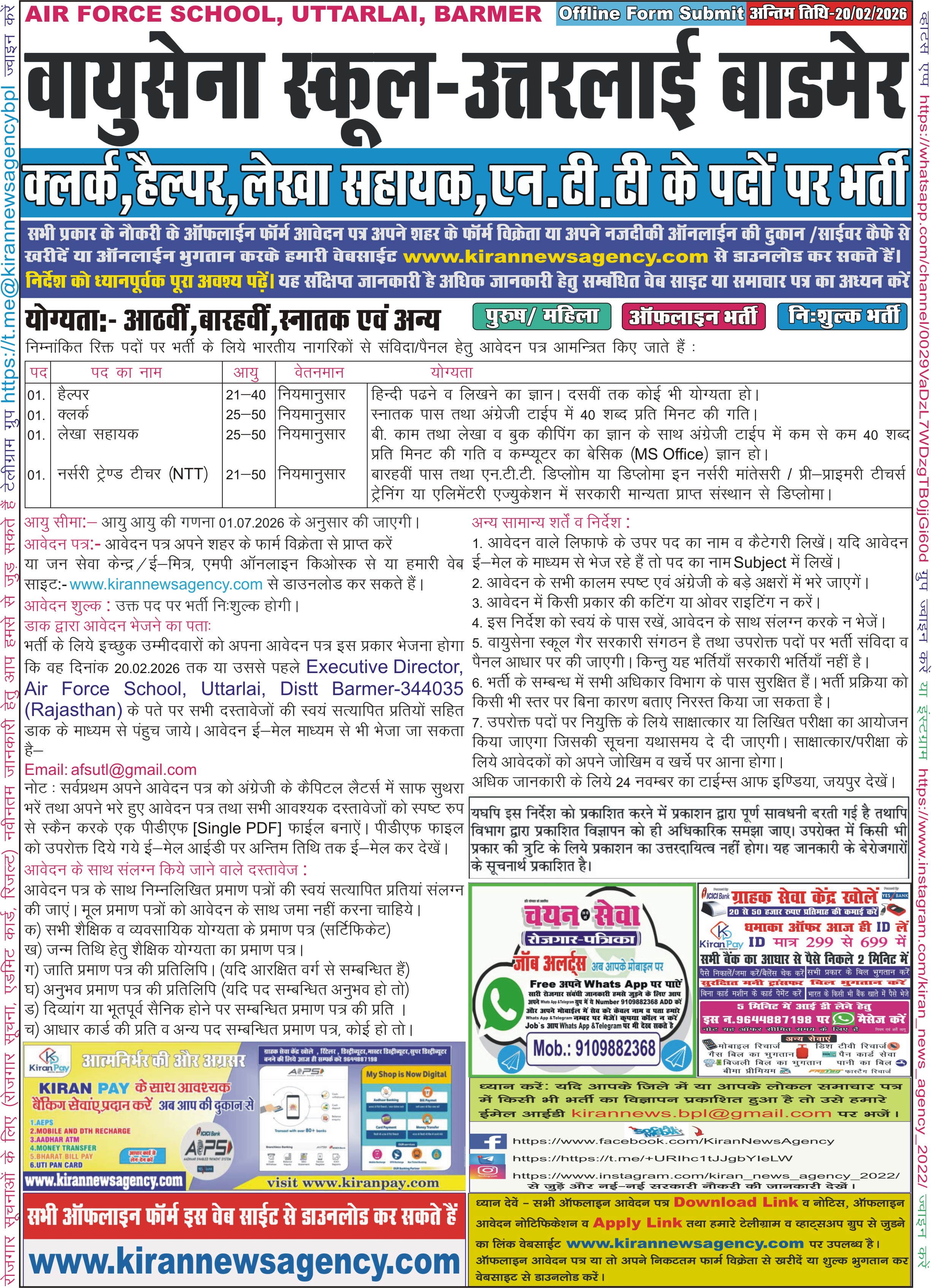 Air Force School, Chakeri Kanpur   |    Airforce School Uttarlai Barmer   |    PM Shri KV Raisen   |    Punjab National Bank Gurugram   |    Jila Nirvachan Karyalay Khandwa   |    District & Sessions Court, Palwal   |    District & Sessions Court, Faridabad   |    Nanaji Deshmukh Veterinary Science University Jab   |    District & Sessions Court, Gurugram   |    District & Sessions Court, Panipat   |    District & Sessions Court, Rohtak   |    Jila Nyayalay Gurugram   |    Sainik School Chittorgarh   |    Banaras Hindu University [BHU], Varanasi    |    Cental Bank of India, New Delhi   |    IIT BHU Varanasi   |    Panipat Urban Cooperative Bank Ltd., Panipat   |    Sardar Singh Nagrik Sahkari Bank Maryadit Tikamga   |    College of Agriculture Balaghat   |    7012 EME Bn Jodhpur   |    Air Force School Jodhpur Account   |    Air Force School Jodhpur Helper   |    Artillery School, Devlali, Distt : Nasik   |    ECHS Bharatpur   |    ECHS Jodhpur   |    ECHS Mathura   |    MPESB ITI Training Officer    |    RBI Office Attendant Online   |    RSSB Clerk Gr-II/ Junior Assistant   |    Kamala Nehru College Delhi   |    AIIMS Bhopal Multitasking Staff   |    Central Bank of India Bhopal Attender   |    Central Bank of India, Bhopal Office Assistant   |    Central Bank of India, Bhopal Watchman Cum Gardene   |    ECHS Amritsar   |    ECHS Bareilly   |    Indian Airforce Agniveer Vayu Intake    |    MP Psc Pre 2026 (State Services, State Forest Serv   |    MP Local Election Office 51 District   |    Air Force School Bhuj   |    Air Force School Hindan Ghaziabad   |    District Basic Education Office, Fatehpur   |