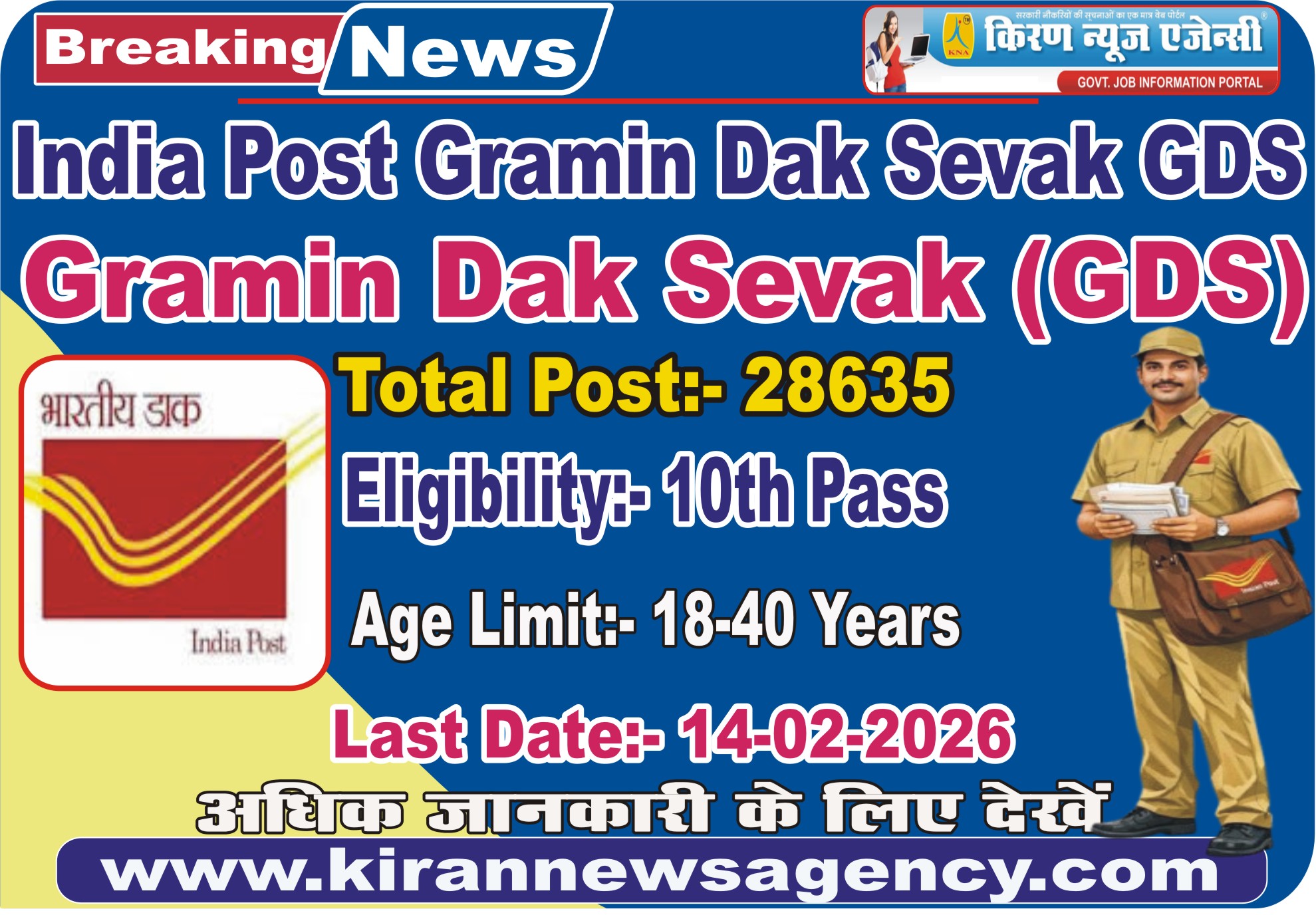 Gramin Dak Sewak GDS 2026 | 28635 | - Class 10 High School with Mathematics and English as a Subject.