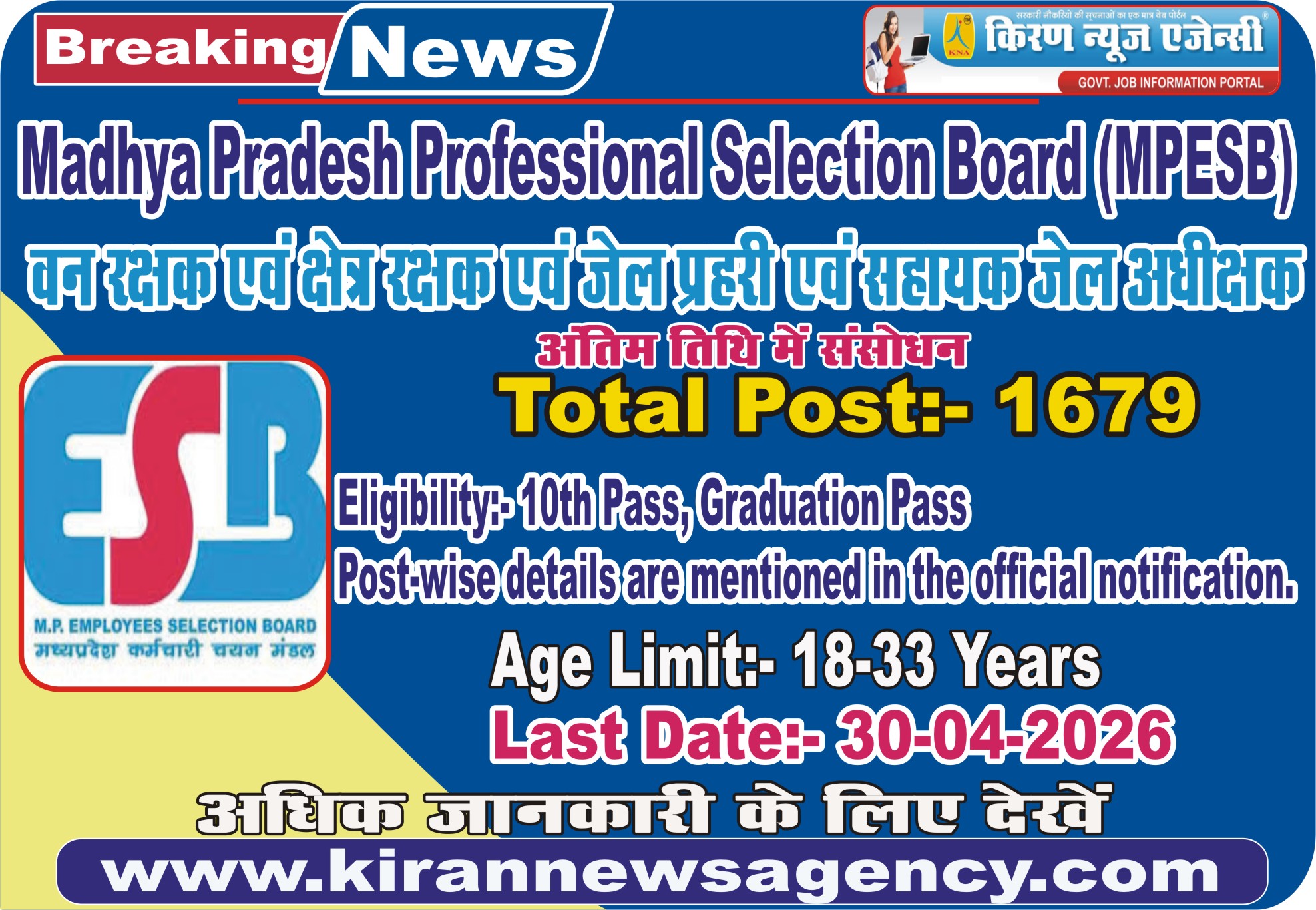 - MPESB MP Van Rakshak & Kshetra Rakshak (Karyapalik) (Van Vibhag), Jail Prahari (Karyapalik)(Jail Vibhag) and Jail Superintend Recruitment for Various Post Candidate Can Apply Between 28/02/2026 to 30/04/2026