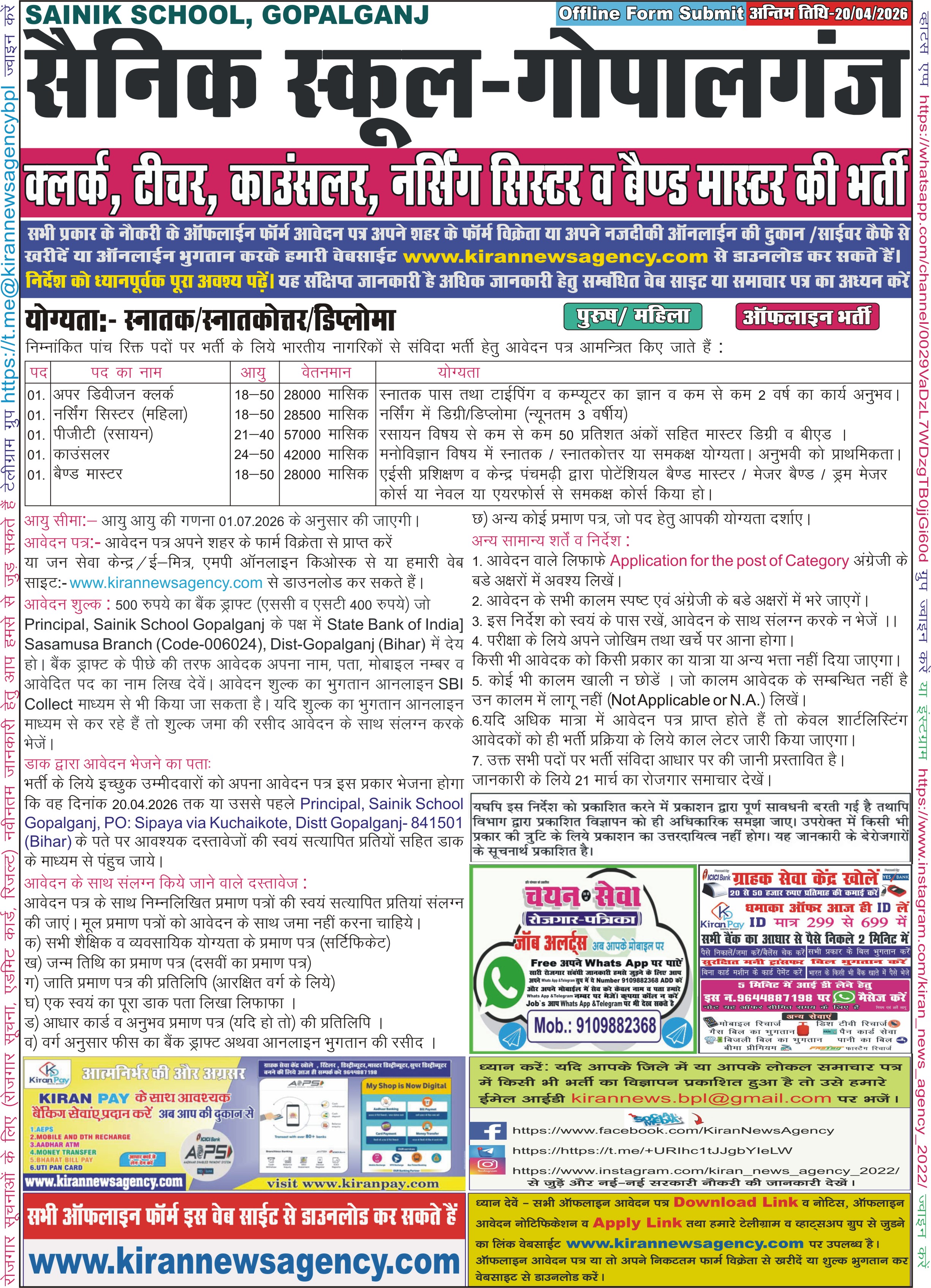 Recruitment :- Clerk, PGT, Counsellor, Nusing Sister, Band Master
