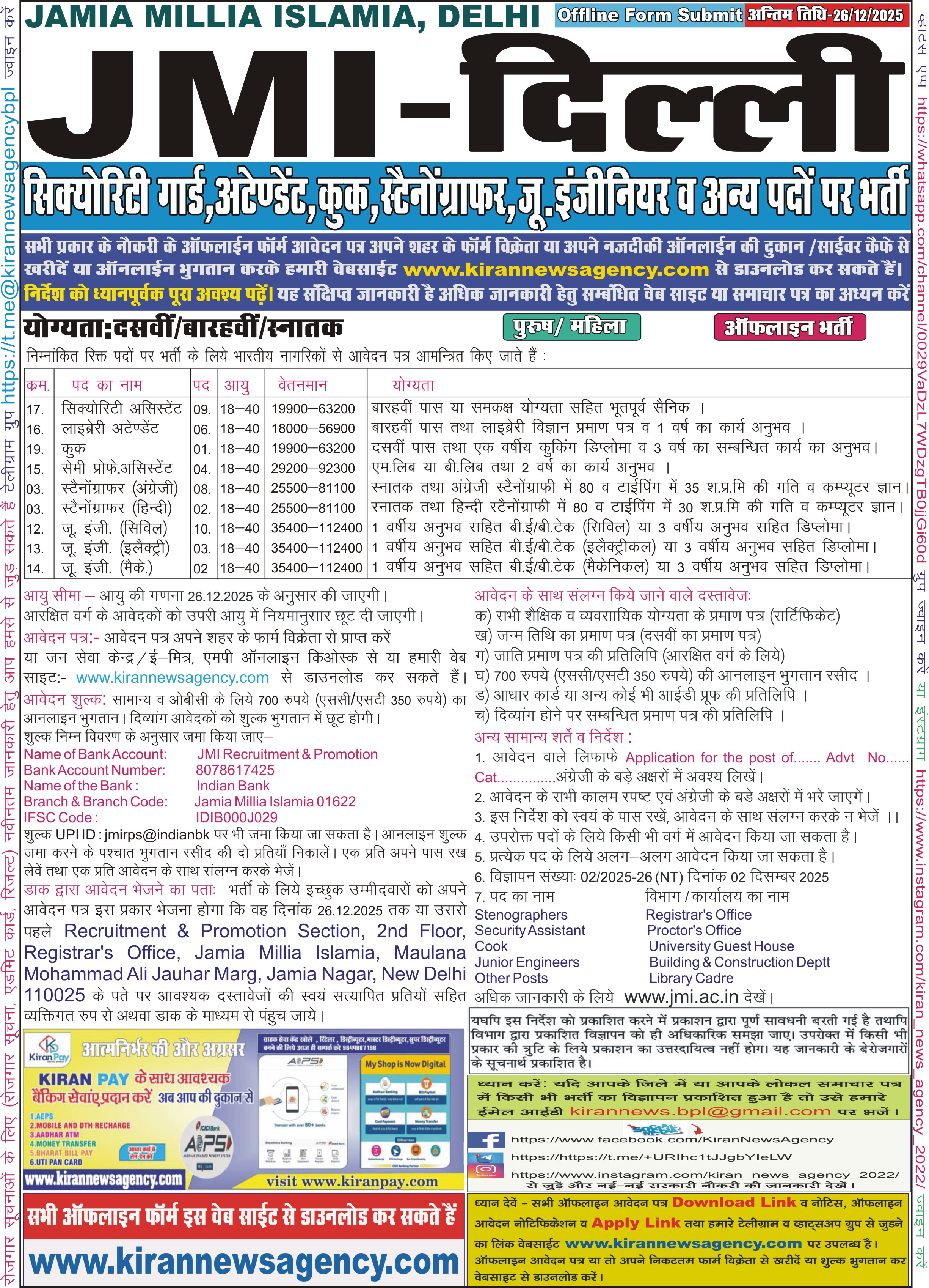 Recruitment :- Security Assistant, Cook, Library Attendant, Junior Engineer, Stenographer