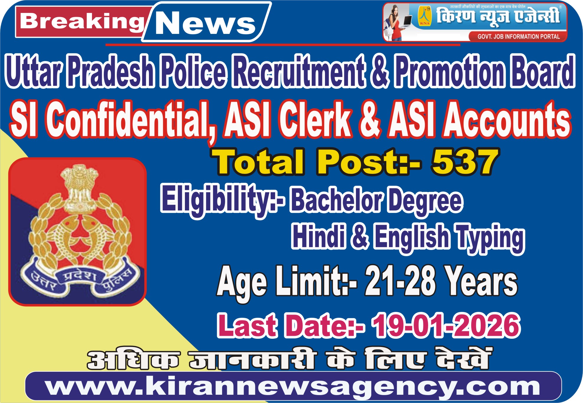 Recruitment :- UP Police SI Confidential, ASI Clerk & ASI Accounts Recruitment 2025