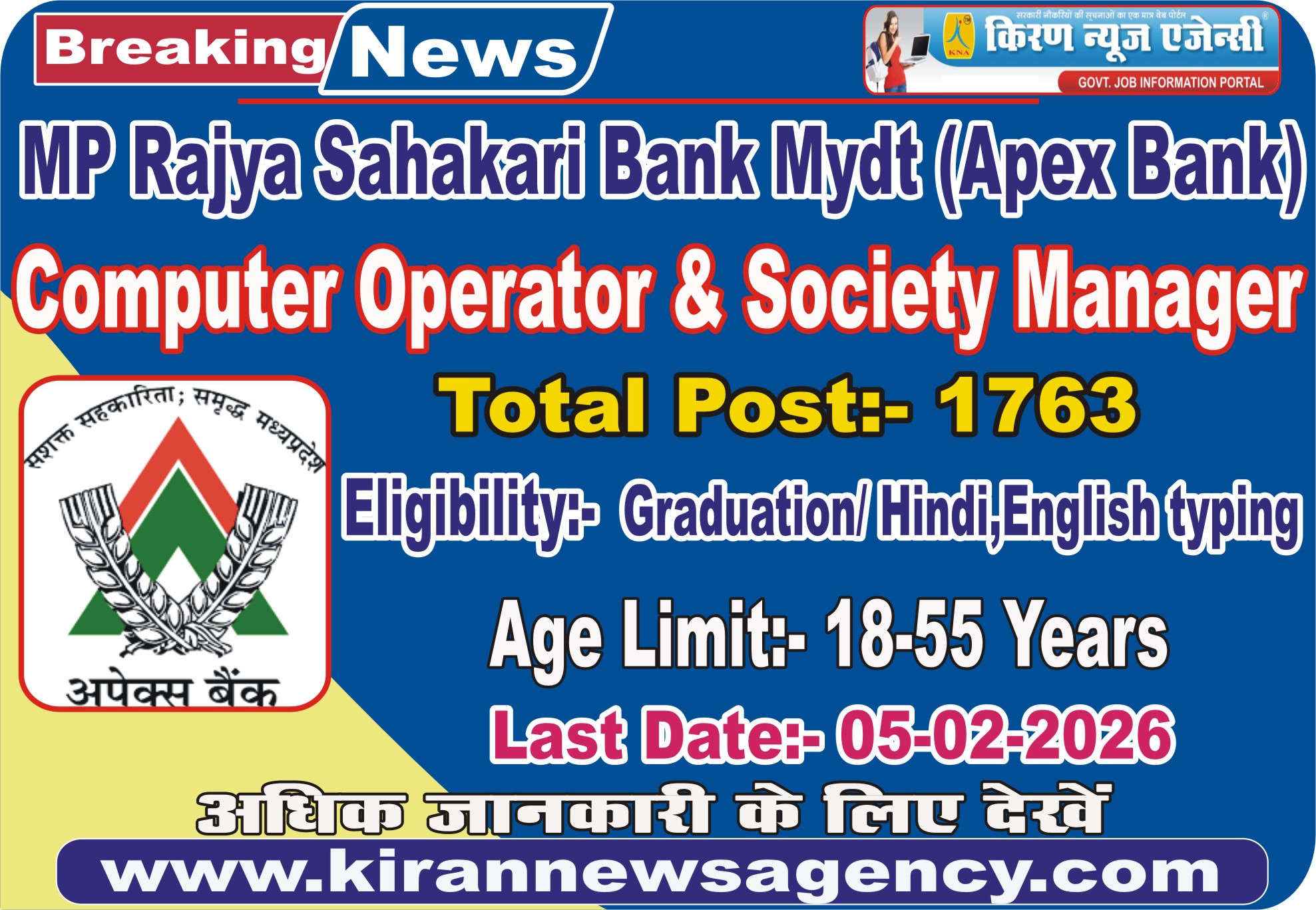 MP Apex Bank Computer Operator & Society Manager Online Form 2026 : How To Apply- Candidates can apply through link https://apexbankmp.bank.in/ or provided below in link section or they can also apply through official site of the MP Apex Bank before Last Date.