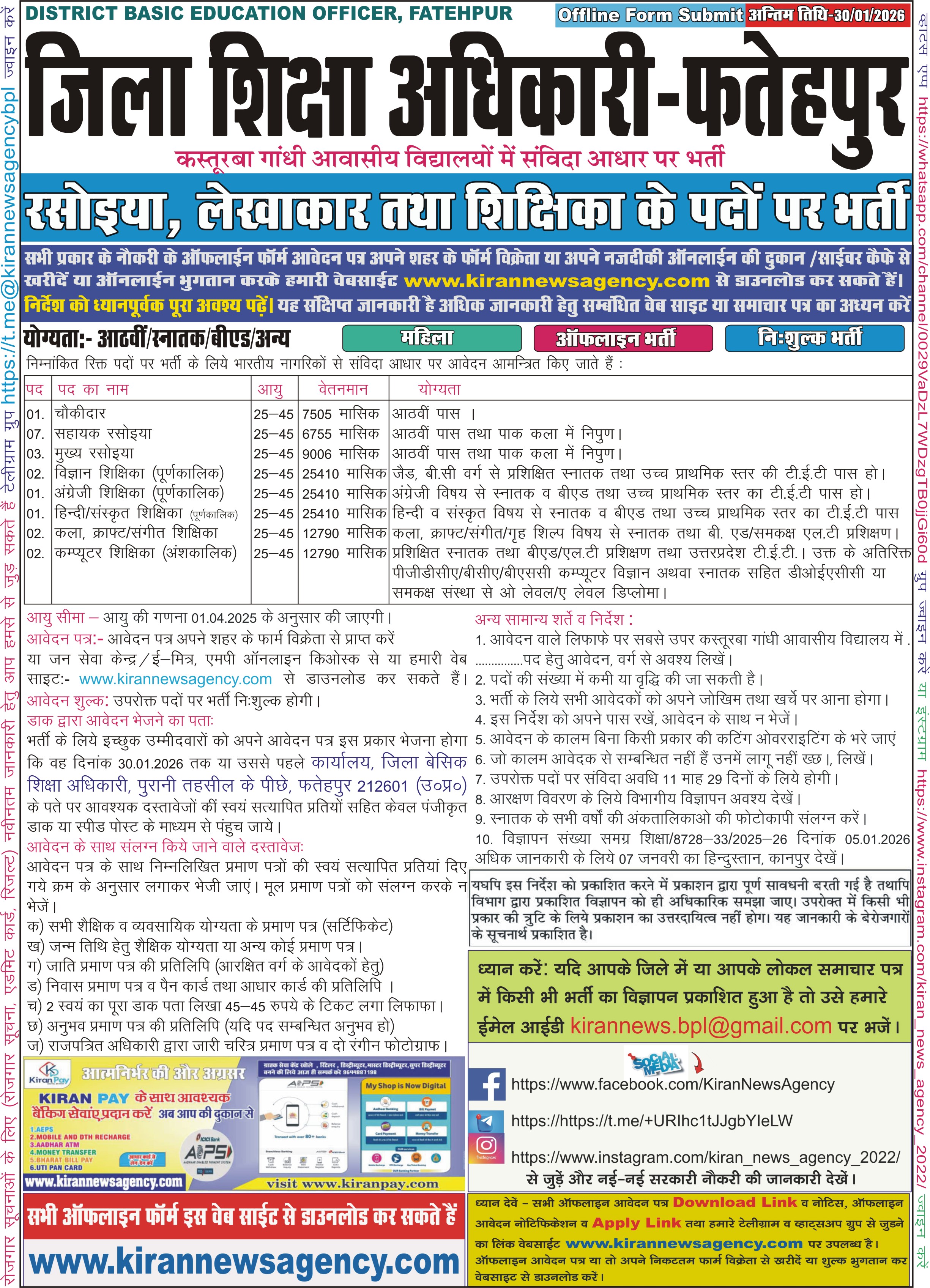 Recruitment :- Chowkidar, Cook, Teacher