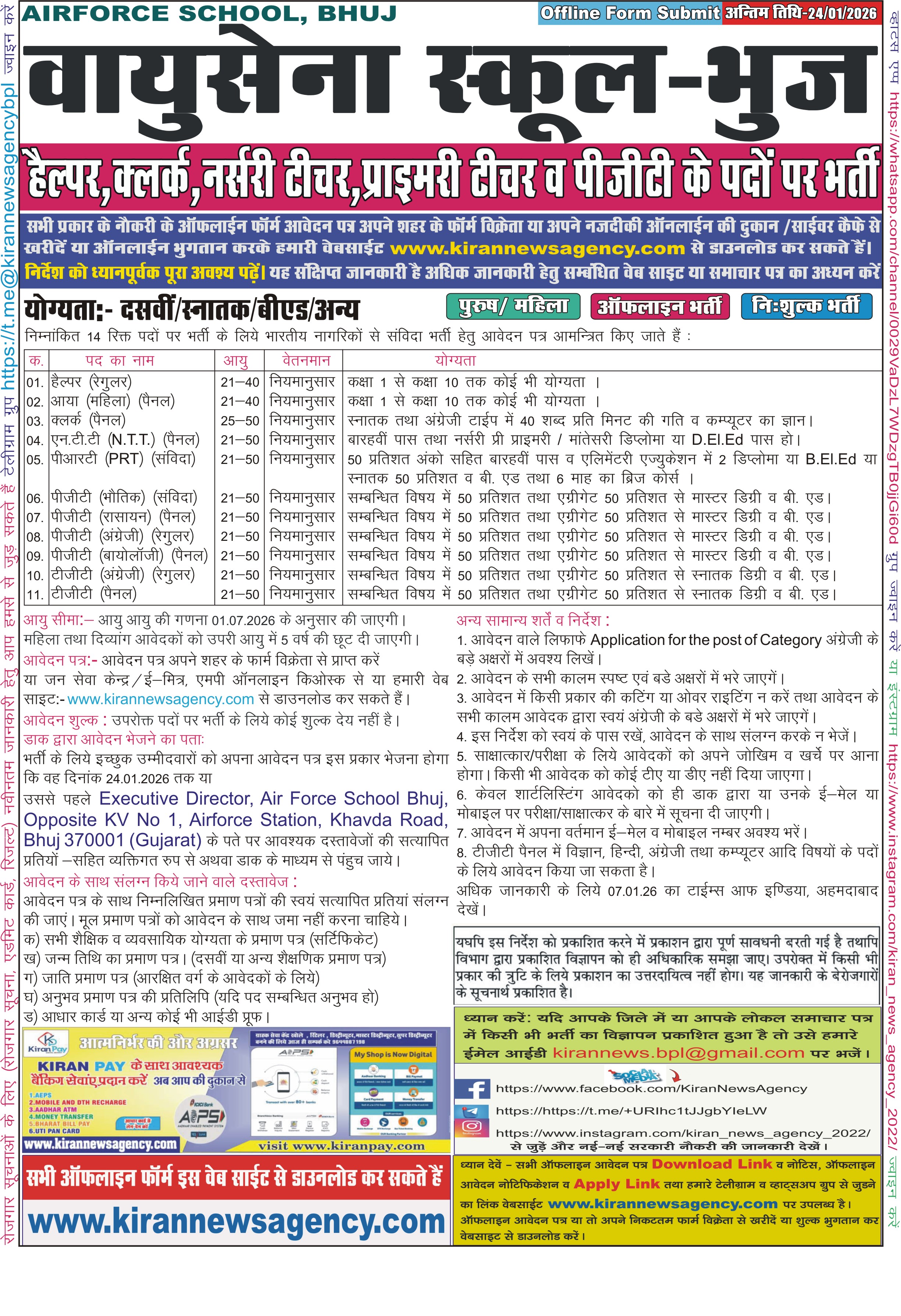 Recruitment :- Helper, Aaya, Clerk, NTT, PRT, TGT, PGT Teacher