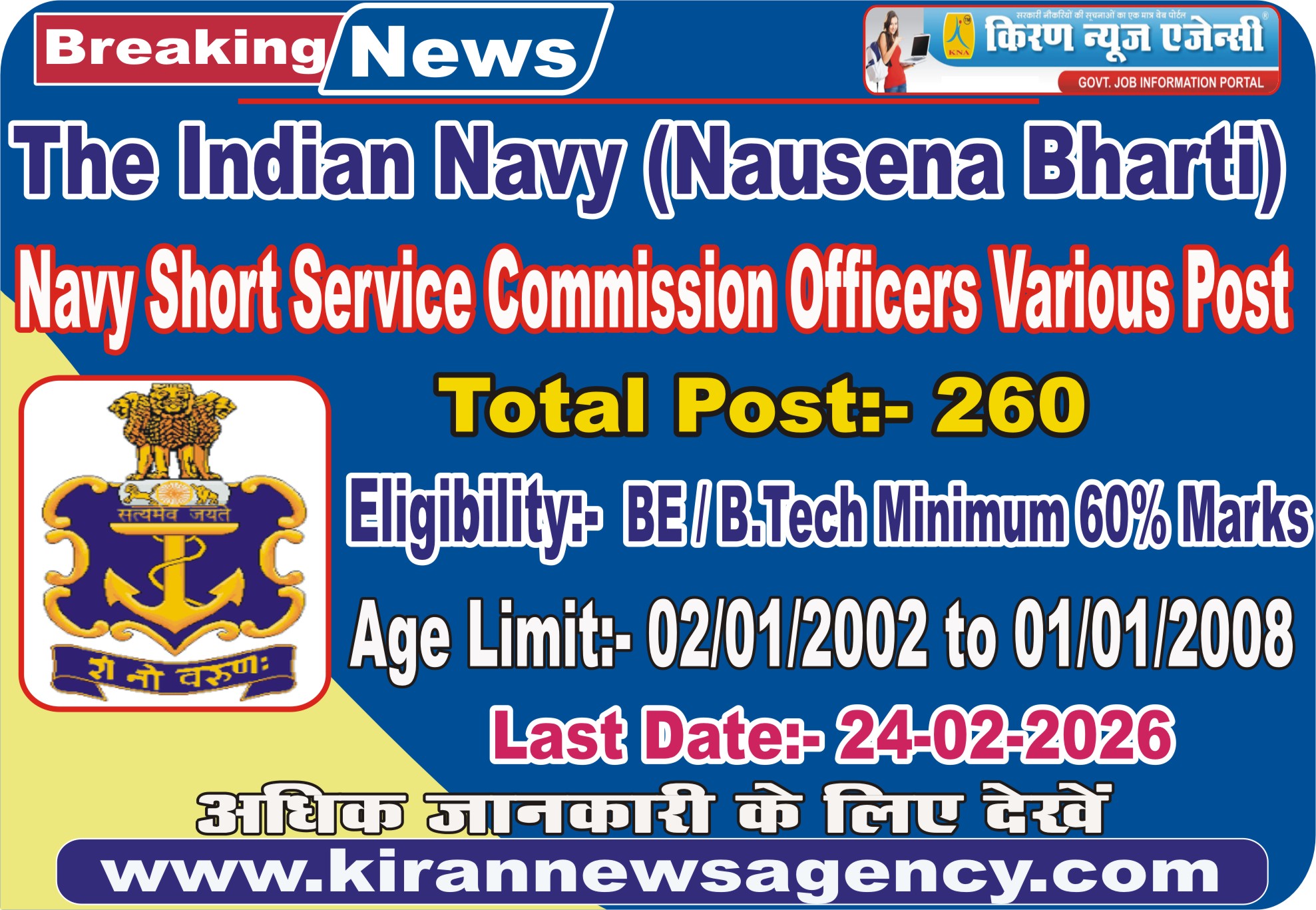 Navy Various SSC Officers Entry January 2027 : Vacancy Details Total : 260 Post |
