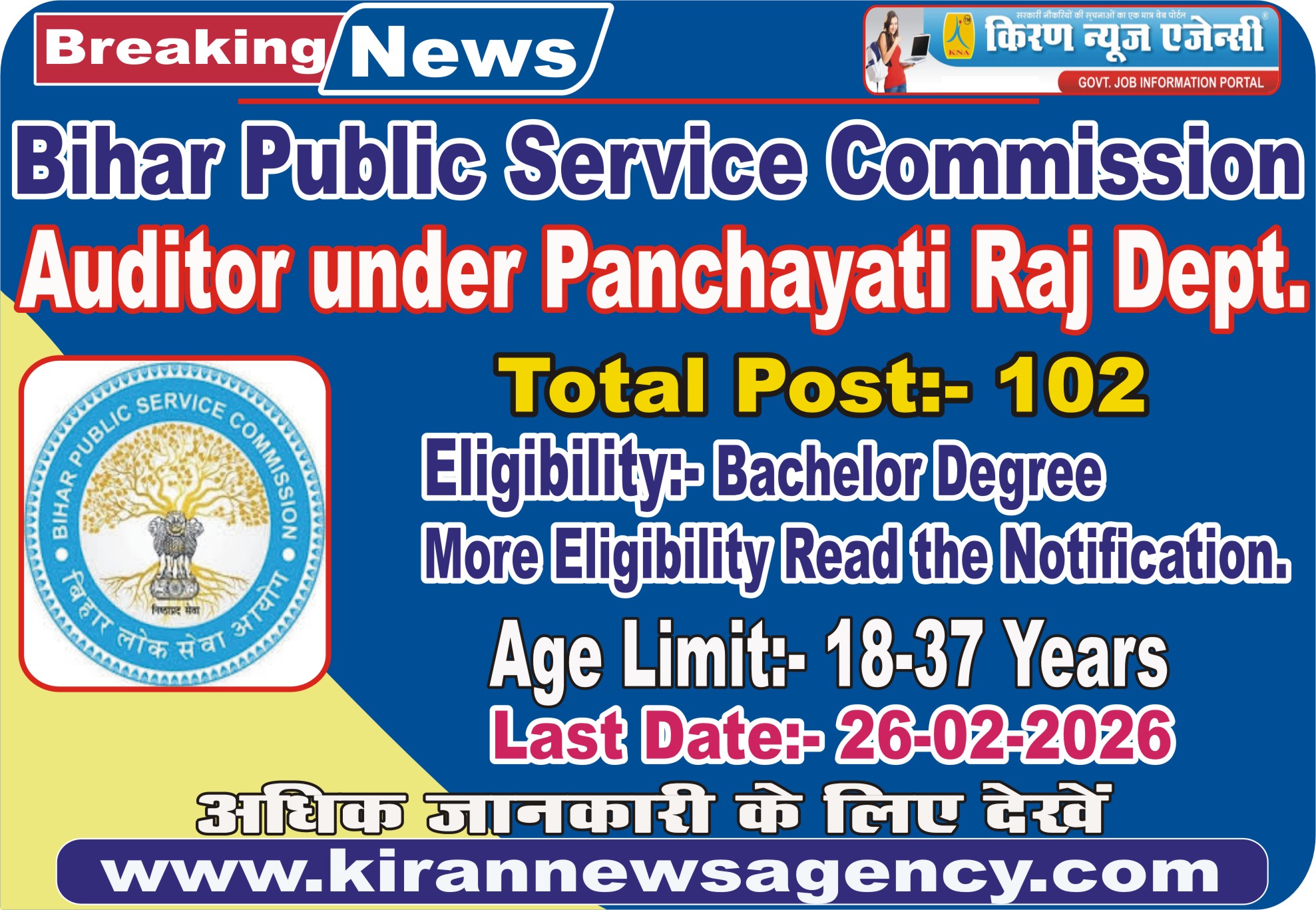 Bihar BPSC Auditor Exam 2026 : Vacancy Details Total : 102 Post |
