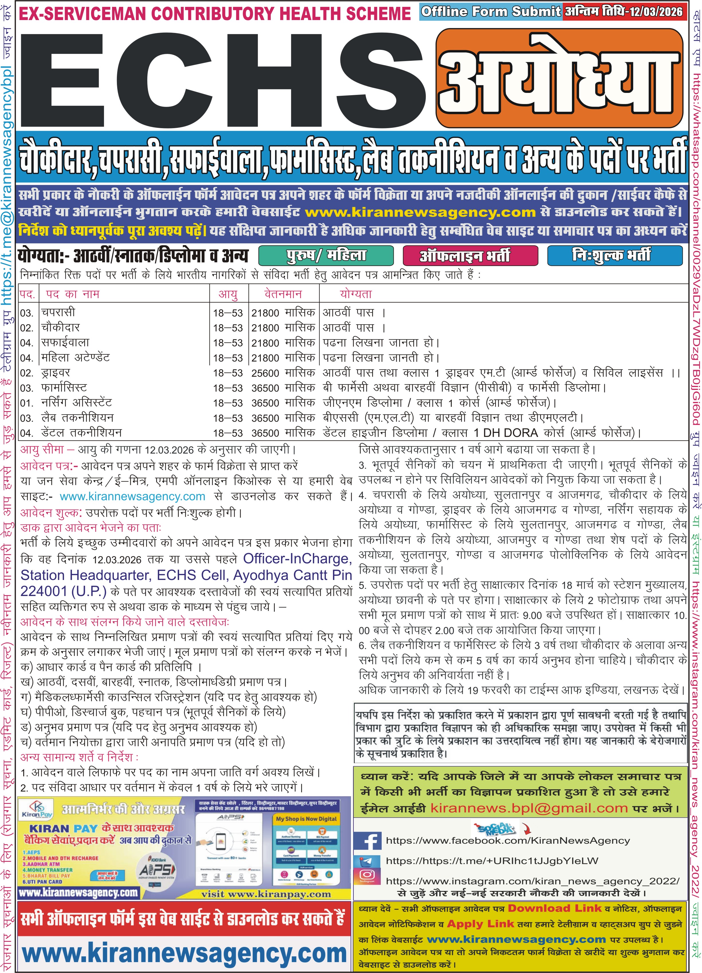 Recruitment :- Peon, Chowkidar, Safaiwala, Female Attendant, Driver, Nursing Assistant, Pharmacist, Lab Technician, Dental Technician
