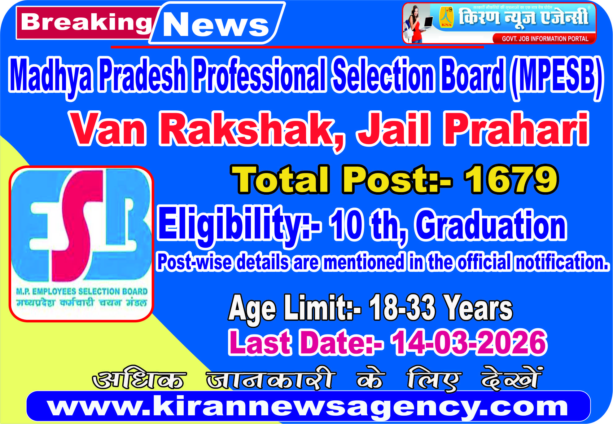MPESB MP Van Rakshak, Jail Prahari Recruitment 2026 : Vacancy Details Total : 1679 Post |