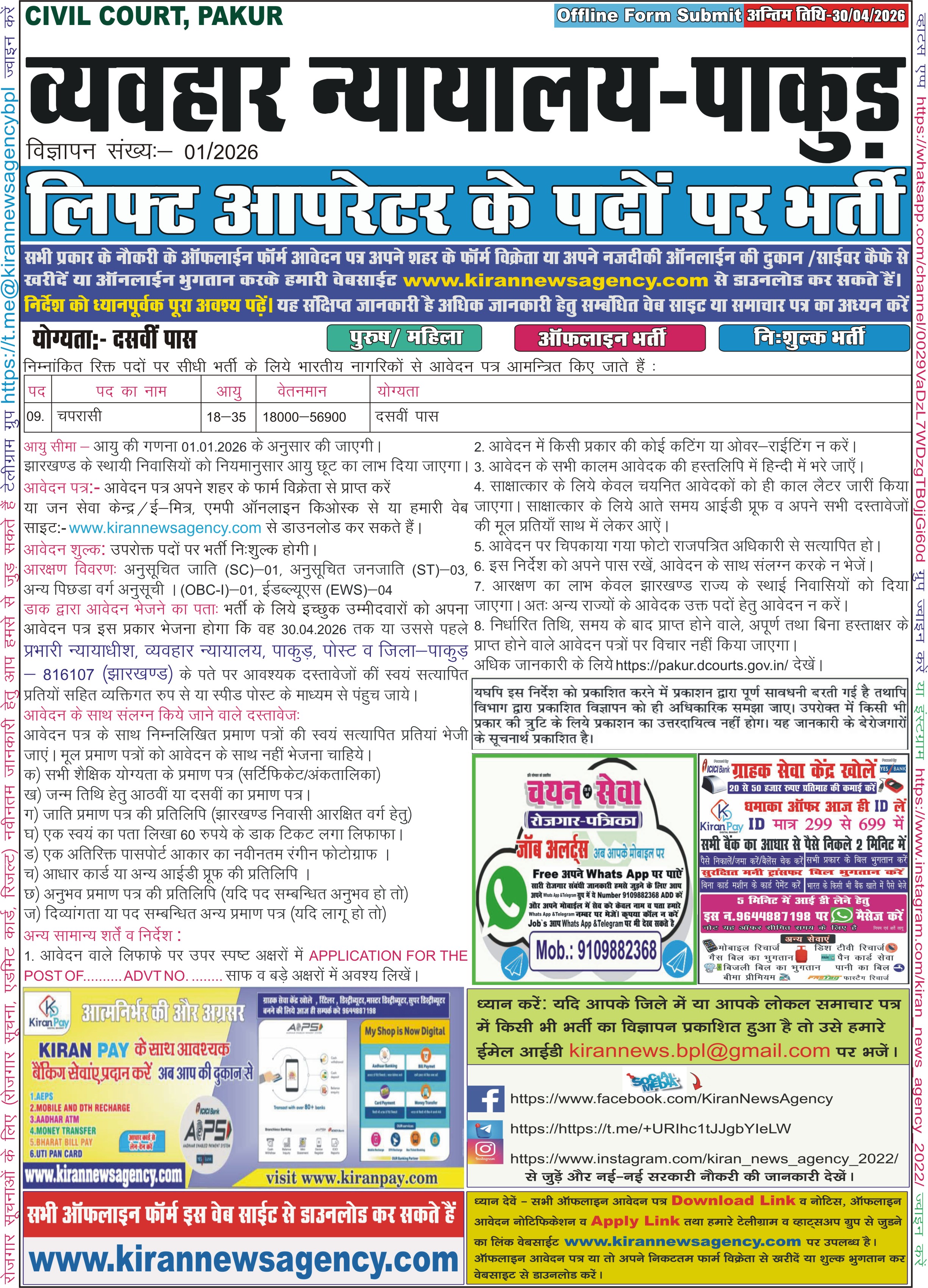 आवेदक को सलाह दी जाती है की सर्वप्रथम आवेदक विज्ञापन में दी हुई समस्त जानकारी को ध्यानपूर्वक पढ़े (यह संक्षिप्त विज्ञापन है)