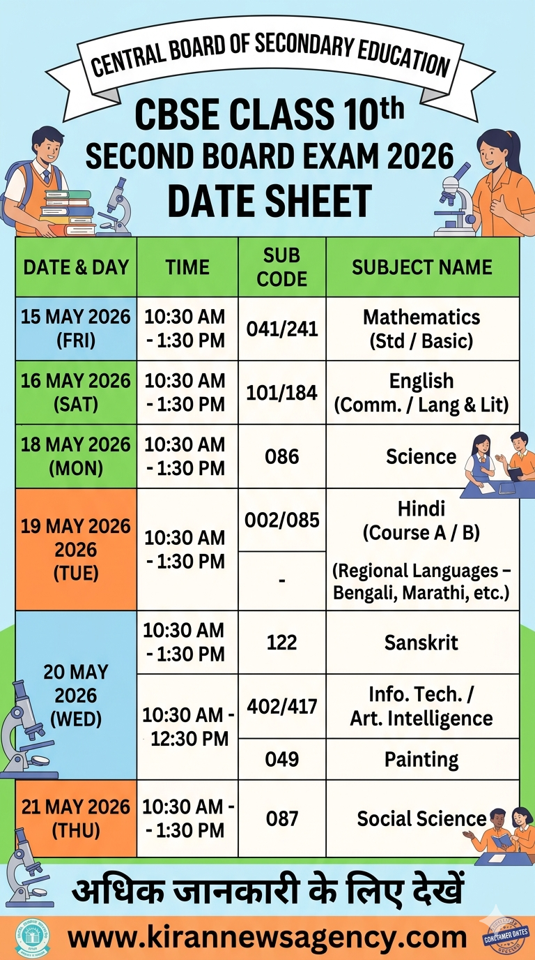 CBSE Class 10th Second Board Exam 2026 Time Table 2026