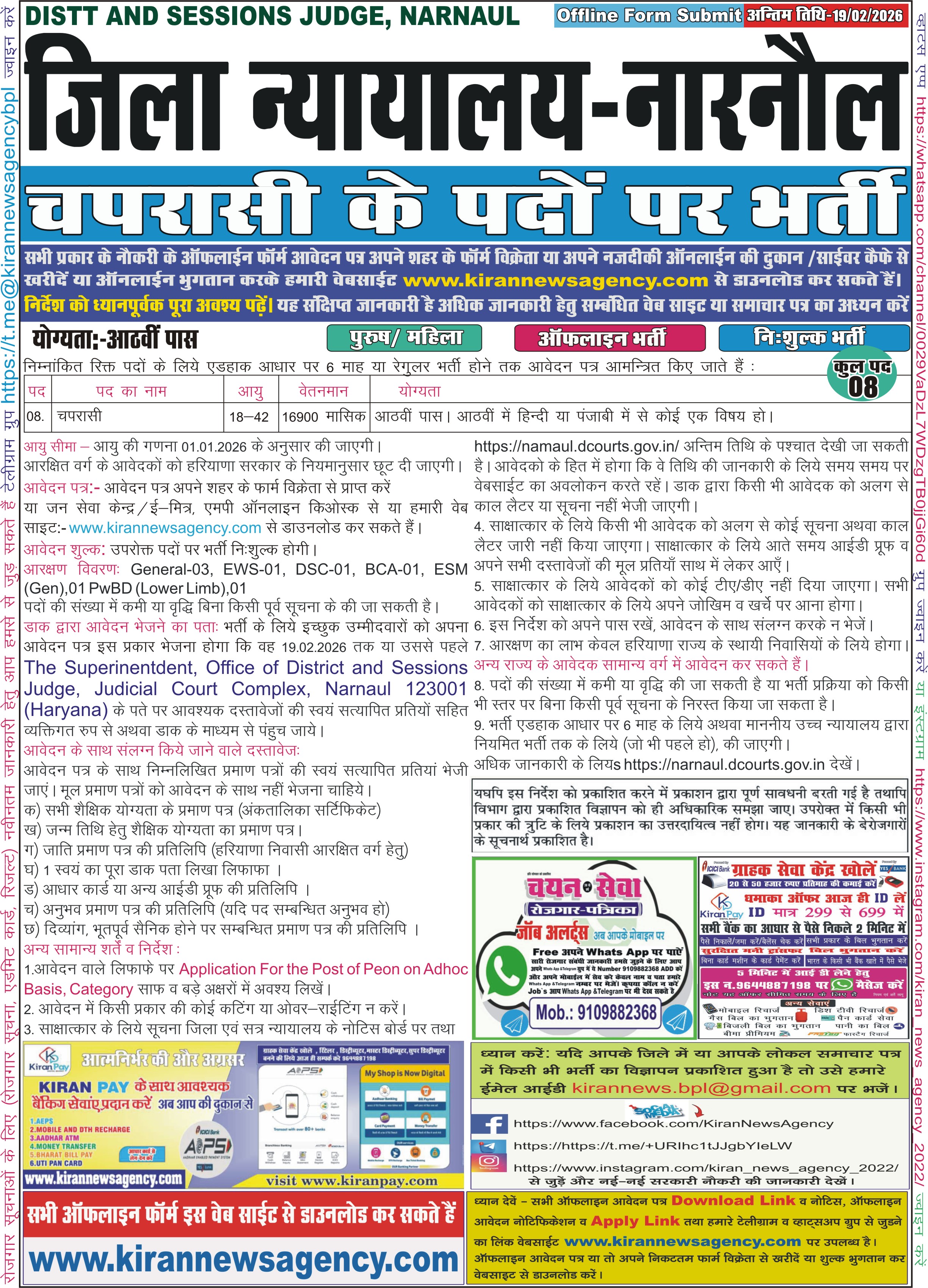 District & Sessions Court, Jhajjar   |    District & Sessions Court, Narnaul   |    District & Sessions Court, Sirsa   |    District & Sessions Court, Sonipat   |    ECHS Agra   |    ECHS Bikaner   |    ECHS Dehradun   |    ECHS Hindon, Ghaziabad   |    ECHS Meerut   |    MP Shri KV Khandwa MP   |    UPSC Civil Services IAS Pre    |    MP Apex Bank Computer Operator & Society Manager L   |    MP Apex Bank Officer Grade 1 & 2 Last Date Extende   |    MPESB MP Police ASI, HC Computer    |    Rajasthan RSSB Women Supervisor   |    Bihar Police BPSSC ASI Operation   |    Yantra India Ltd YIL Ordnance Factory    |    Delhi High Court Junior Judicial Assistant (JJA)   |    CSBC Bihar Police Constable Special Branch    |    BSNL Senior Executive Trainee SET   |    Bihar BPSC Auditor under Panchayati Raj Dept.   |    Indian Navy SSC Officers    |    Rajasthan RSSB Lab Assistant   |    Bihar Police BPSSC Sub Inspector Prohibition   |    BECIL Bangalore   |    ECHS Bhopal   |    ECHS Jalandhar Cantt   |    ECHS Jhansi   |    Hotel Management Kolkata   |    Passport Office Secunderabad   |    Animal Welfare Board of India Ballabhgarh   |    Sainik School Tilaiya   |    India Post GDS Online Form 2026   |    Railway RRB Group D    |    SBI Circle Based Officer CBO   |    Jharkhand JPSC Civil Services Pre   |    JPSC Drug Inspector   |    Central Silk Board CSB Scientist B    |    Air Force School Amla M.P.   |    Air Force School Nal Bikaner   |    AIIMS Delhi   |    Air Force School CAMERO Delhi   |    Army Public School Lucknow   |