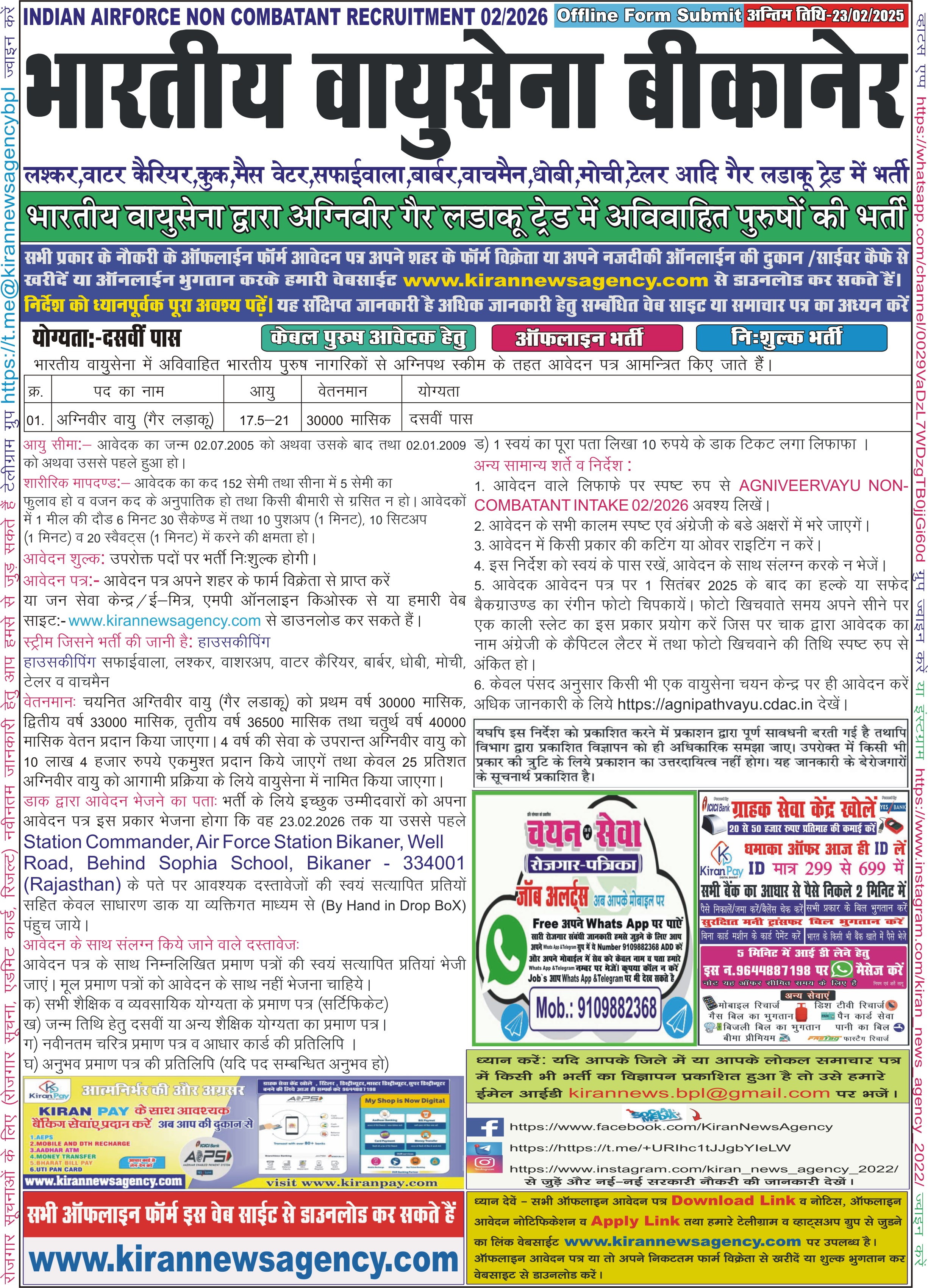 Recruitment :-Agniveer Vayu Non Combatant 02/2026