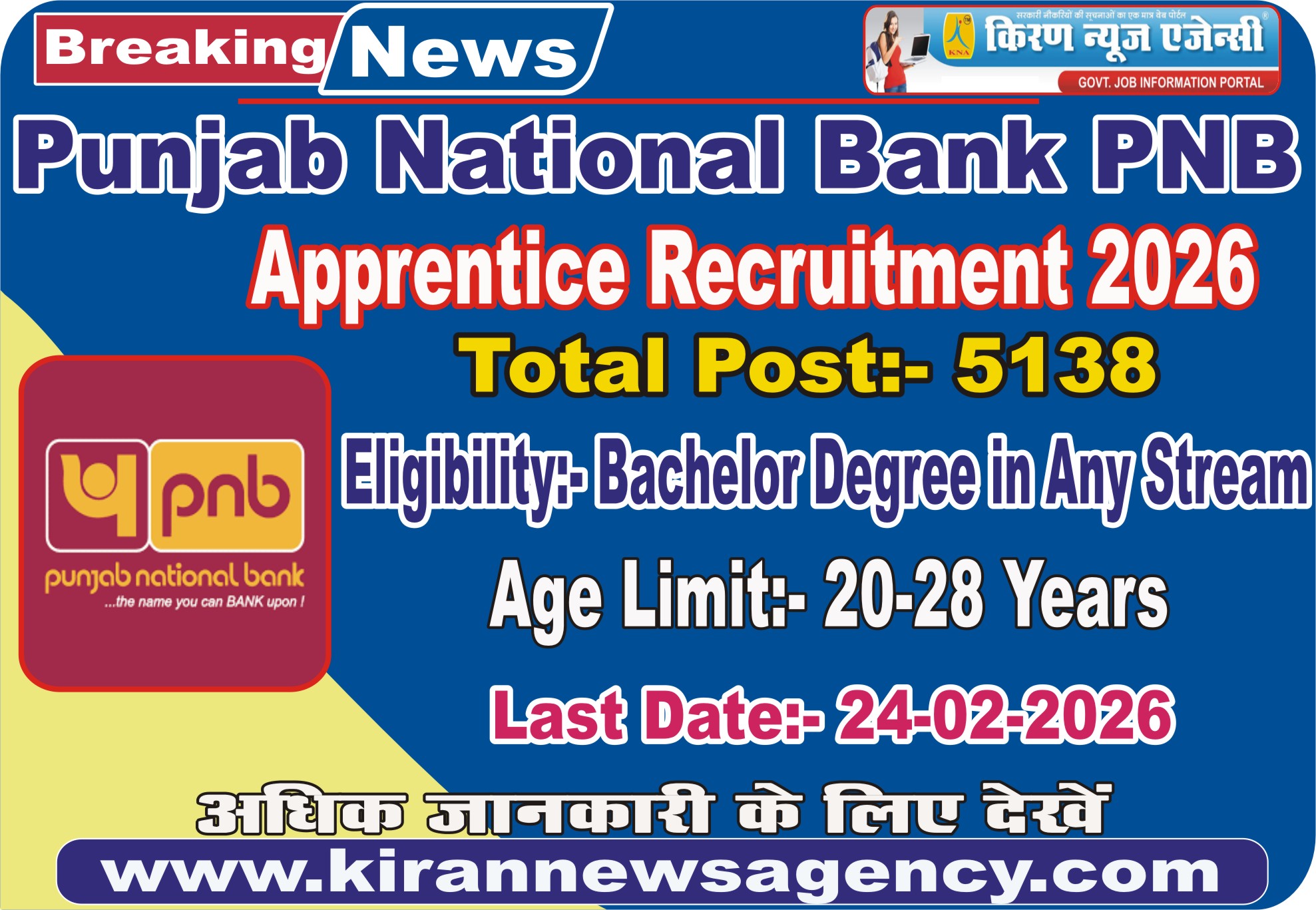 - Punjab National Bank PNB Released Apprentice Recruitment Notification and Invited Online Application Form for the PNB Apprentice Examination 2026. Candidate Can Apply Online for 08/02/2026 to 24/02/2026.