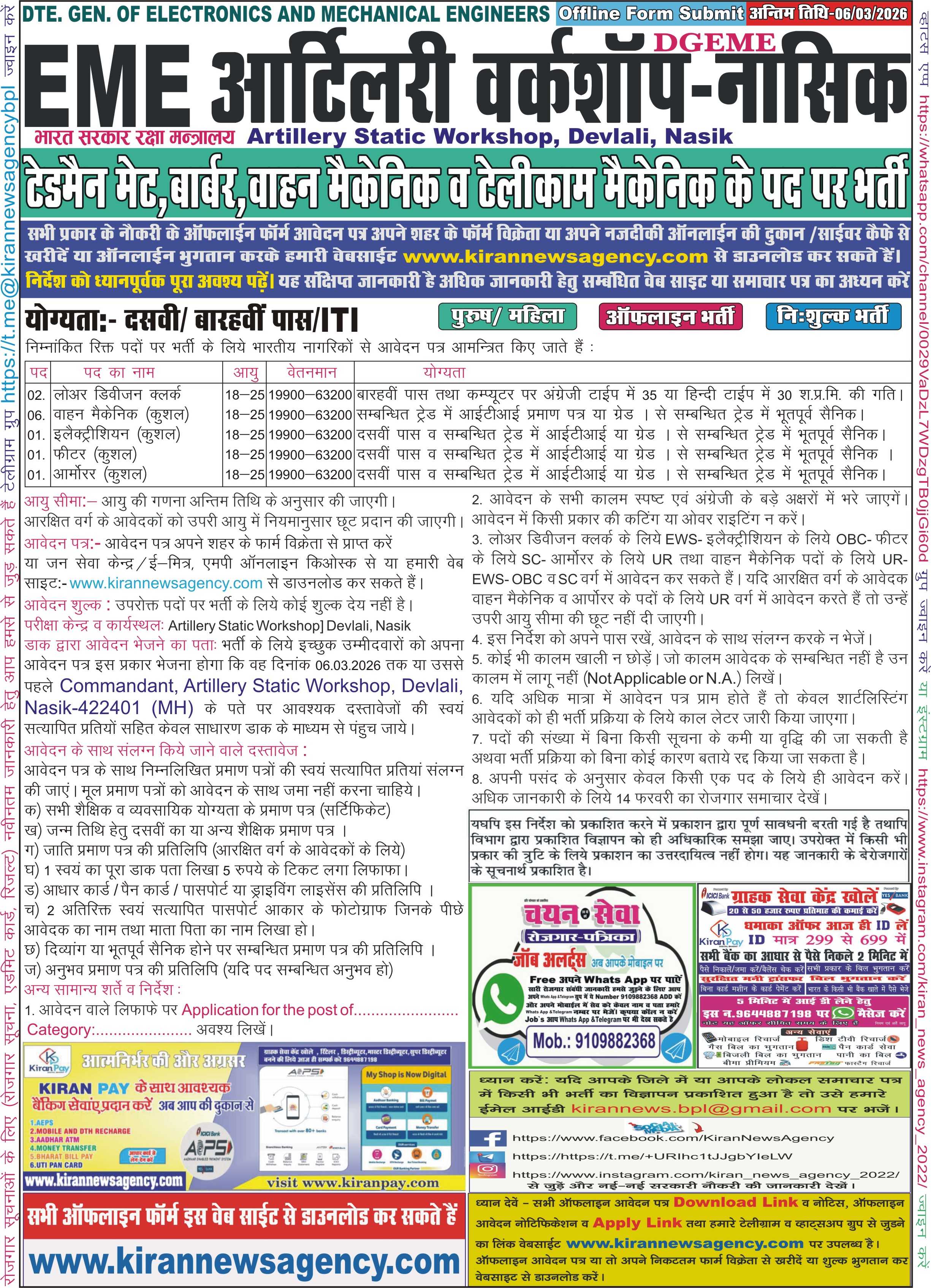 Recruitment :- Clerk, Vehicle Mechanic, Electrician, Fitter, Armourer