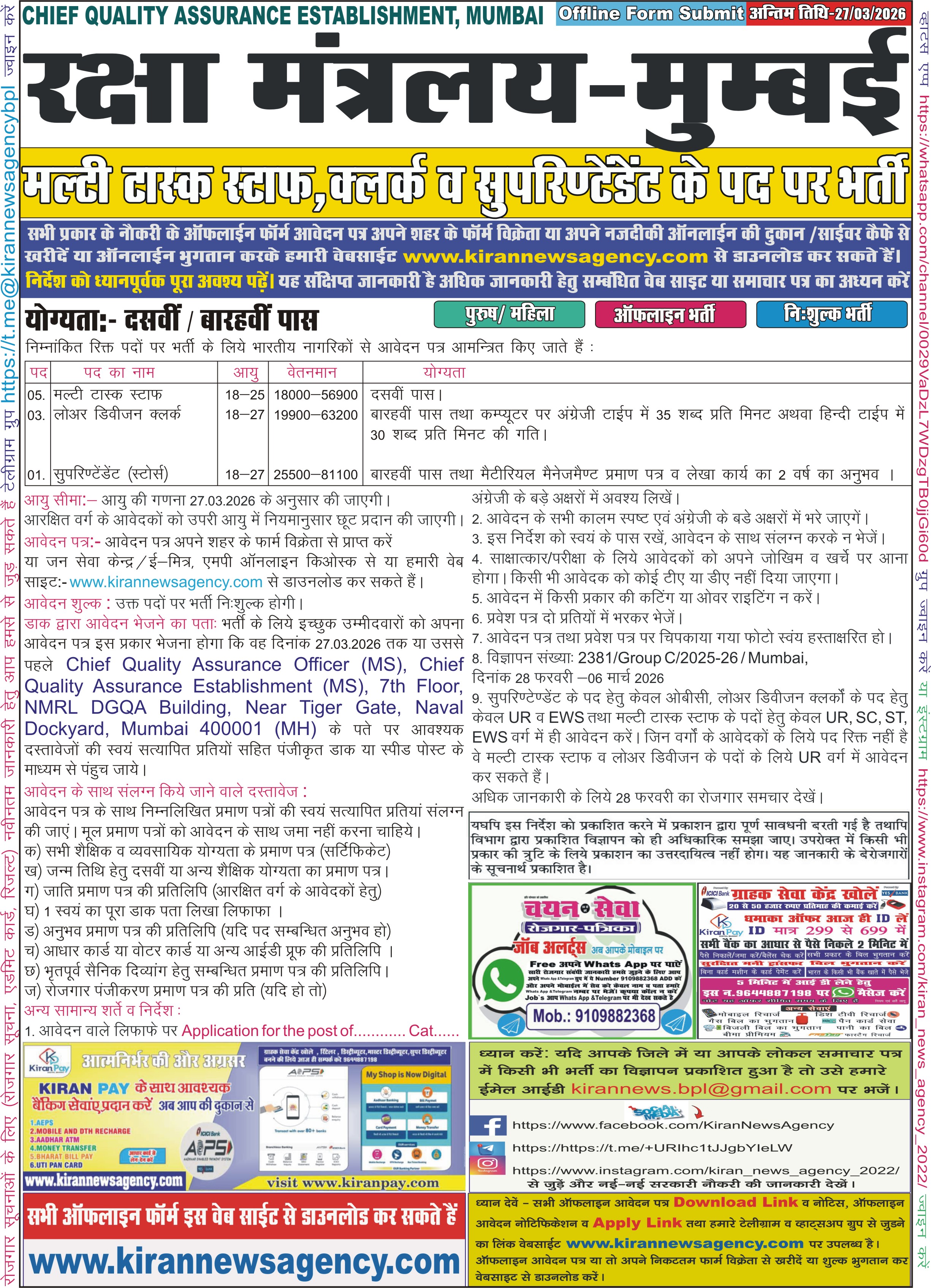 Central Bank of India Sagar   |    Chief Quality Assurance Establishment, Mumbai   |    Department of Post Office Mumbai   |    ECHS Bhuj   |    MP RTE Admission 2026-227   |    IDBI Bank JAM, Assistant Manager   |    Madhya Pradesh Land Records Management Society (MP   |    MPESB Van Rakshak, Jail Prahari Bharti   |    Air Force School Agra   |    Army Law College, Pune   |    Army Public School Tibri, Gurdaspur   |    Army College of Medical Sciences [ACMS], Delhi Can   |    BECIL Noida   |    District Basic Education Office, Kasganj   |    ECHS Ayodhya Cantt   |    ECHS Ferozepur   |    CSBC Bihar Police Constable Operator   |    South Indian Bank SIB Junior Officer   |    UPSC CPF Assistant Commandant CAPF   |    Air Force Station,Bareilly   |    District & Sessions Court, Lucknow   |    District & Sessions Court Palwal   |    Topchi ESM Canteen, Hoshiarpur   |    Delhi DSSSB AE, JE, ASO & Legal Assistant   |    Reserve Bank of India RBI Assistant    |    BTSC Dairy Field Officer / Technical Officer    |    Static Workshop EME, Mhow   |    Air Force School, Gorakhpur   |    Armoured Corps Centre & School (ACC) Ahilya Nagar   |    Civil Court Hazaribagh   |    Delhi Transport Infrastructure Development Corpor   |    Static Workshop Devlali Nasik   |    AIIMS NORCET 10th Online Form 2026   |    Indian Army Agniveer Rally Recruitment    |    Army NCC Special Entry 124 Course   |    Punjab National Bank PNB Apprentices   |    RBI Non CSG Various Post    |