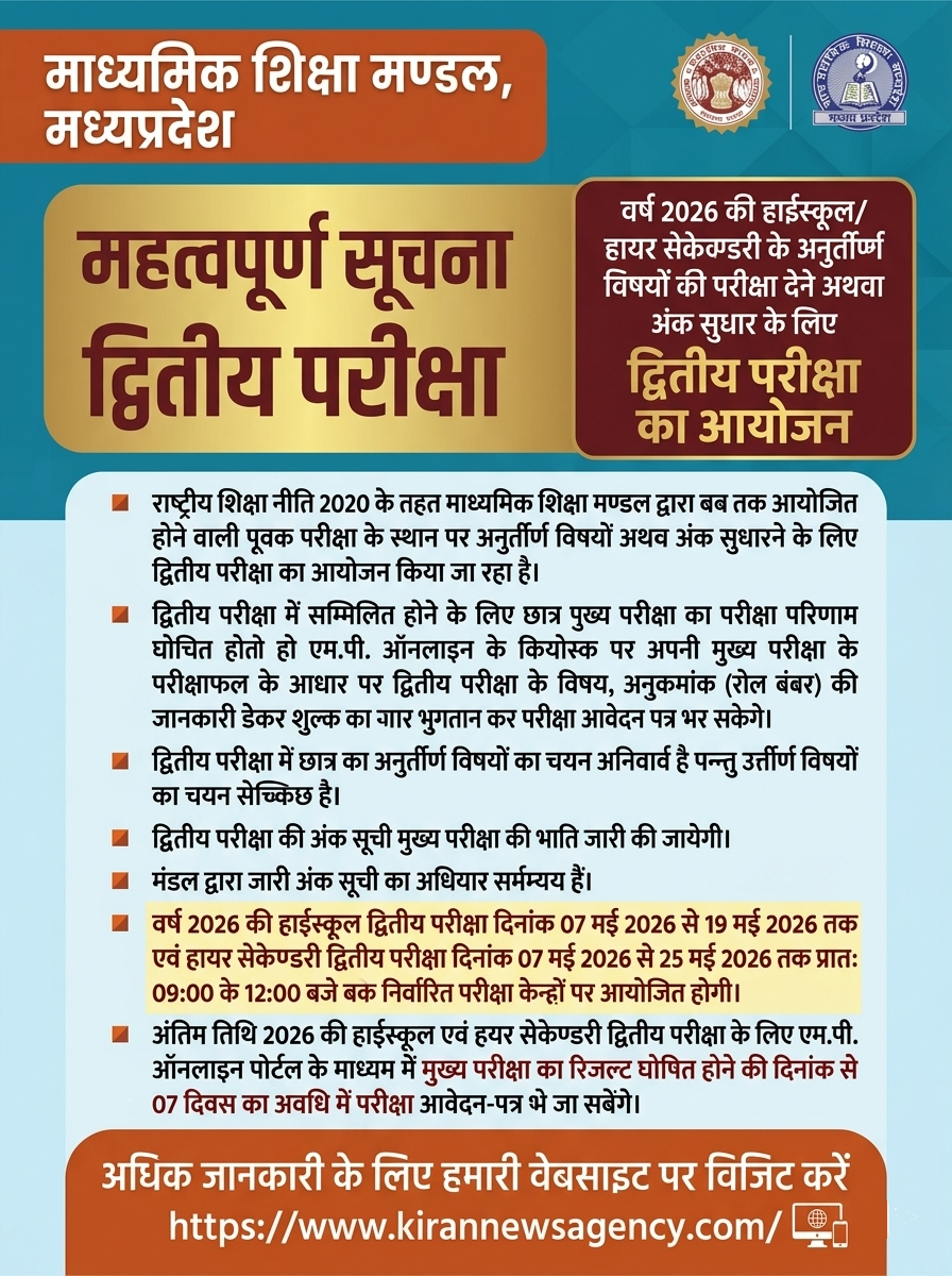मप्र शिक्षा मंडल परीक्षा परिणाम में उर्तीण,अनुर्तीण छात्रों को दूसरा मौका जल्दी करे आवेदन  माध्यमिक शिक्षा मण्डल, मध्यप्रदेश, भोपाल वर्ष 2026 की हाईस्कूल एवं हायर सेकण्डरी सर्टिफिकेट द्वितीय परीक्षा में सम्मिलित होने के लिए संदर्भित पत्र द्वारा विस्तृत निर्देश जारी किए गए है। सत्र 2025-26 की हाईस्कूल एवं हायर सेकण्डरी द्वितीय परीक्षा के लिए एम.पी. ऑनलाईन पोर्टल के माध्यम से दिनांक 15 अप्रैल 2026 से 22 अप्रैल 2026 रात्रि 12:00 बजे तक आवेदन पत्र भरे जा सकेंगे।