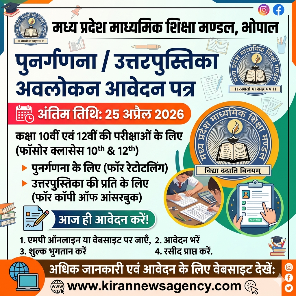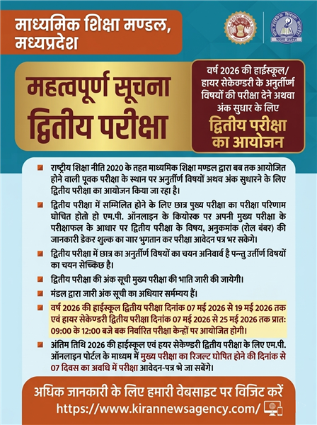 वर्ष 2026 की हाईस्कूल एवं हायर सेकण्डरी सर्टिफिकेट द्वितीय परीक्षा में सम्मिलित होने के लिए संदर्भित पत्र द्वारा विस्तृत निर्देश जारी किए गए है। सत्र 2025-26 की हाईस्कूल एवं हायर सेकण्डरी द्वितीय परीक्षा के लिए एम.पी. ऑनलाईन पोर्टल के माध्यम से दिनांक 15 अप्रैल 2026 से 22 अप्रैल 2026 रात्रि 12:00 बजे तक आवेदन पत्र भरे जा सकेंगे।