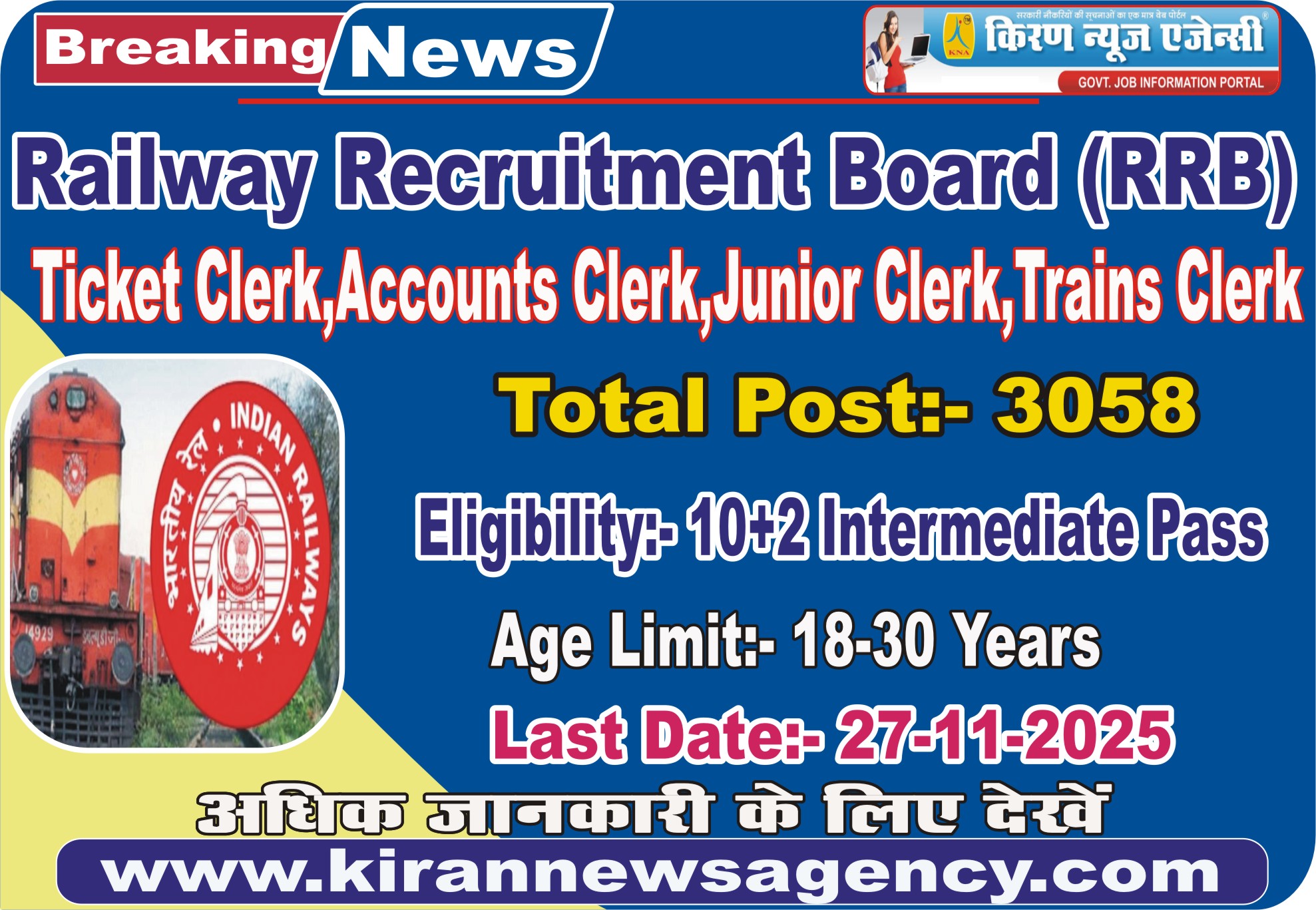 RRB NTPC Under Graduate Level Post Wise Vacancy Details | CEN 07/2025| Post Name | Total Post | | Commercial Cum Ticket Clerk | 2424 | | Accounts Clerk Cum Typist | 394 | | Junior Clerk Cum Typist | 163 | | Trains Clerk | 77 | | Total Post | 3058 |