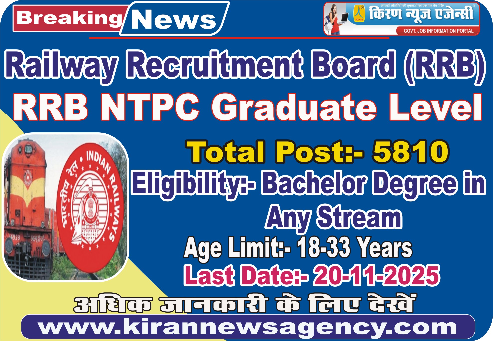 | Post Name | Total Post | Railway RRB NTPC Graduate Level Eligibility 2025 | | Non Technical Popular Categories Graduate Level CEN 06/2025 | 5810 | - Bachelor Degree in Any Stream from Any Recognized University in India.