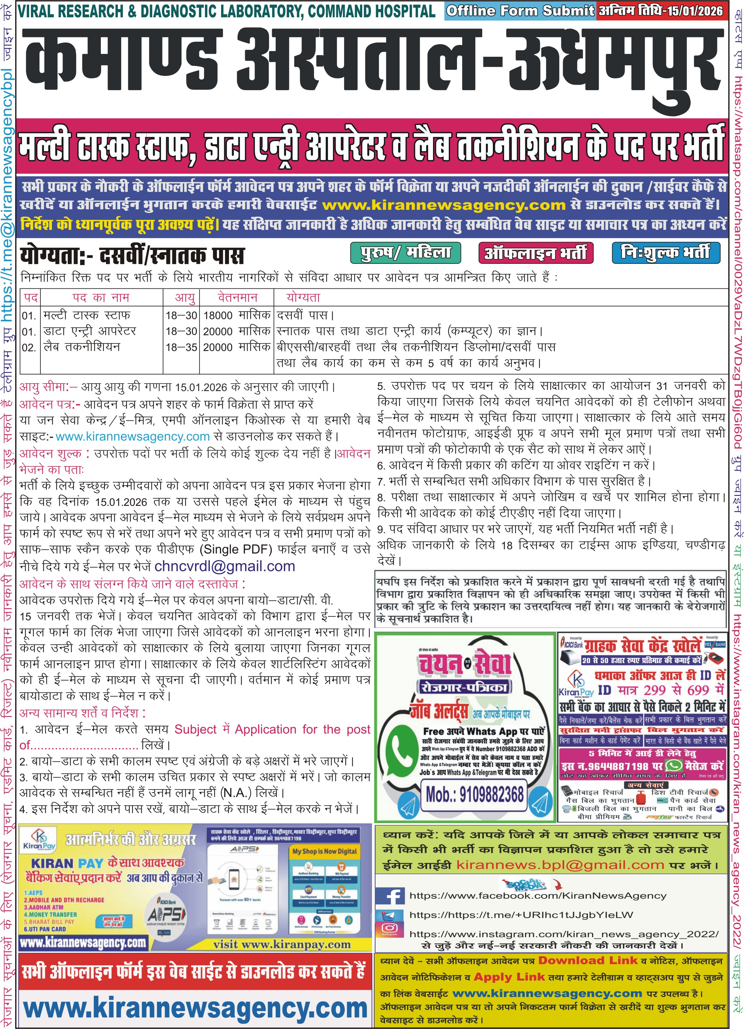 Recruitment :- Multi Task Staff, Data Entry Operator, Lab Technician