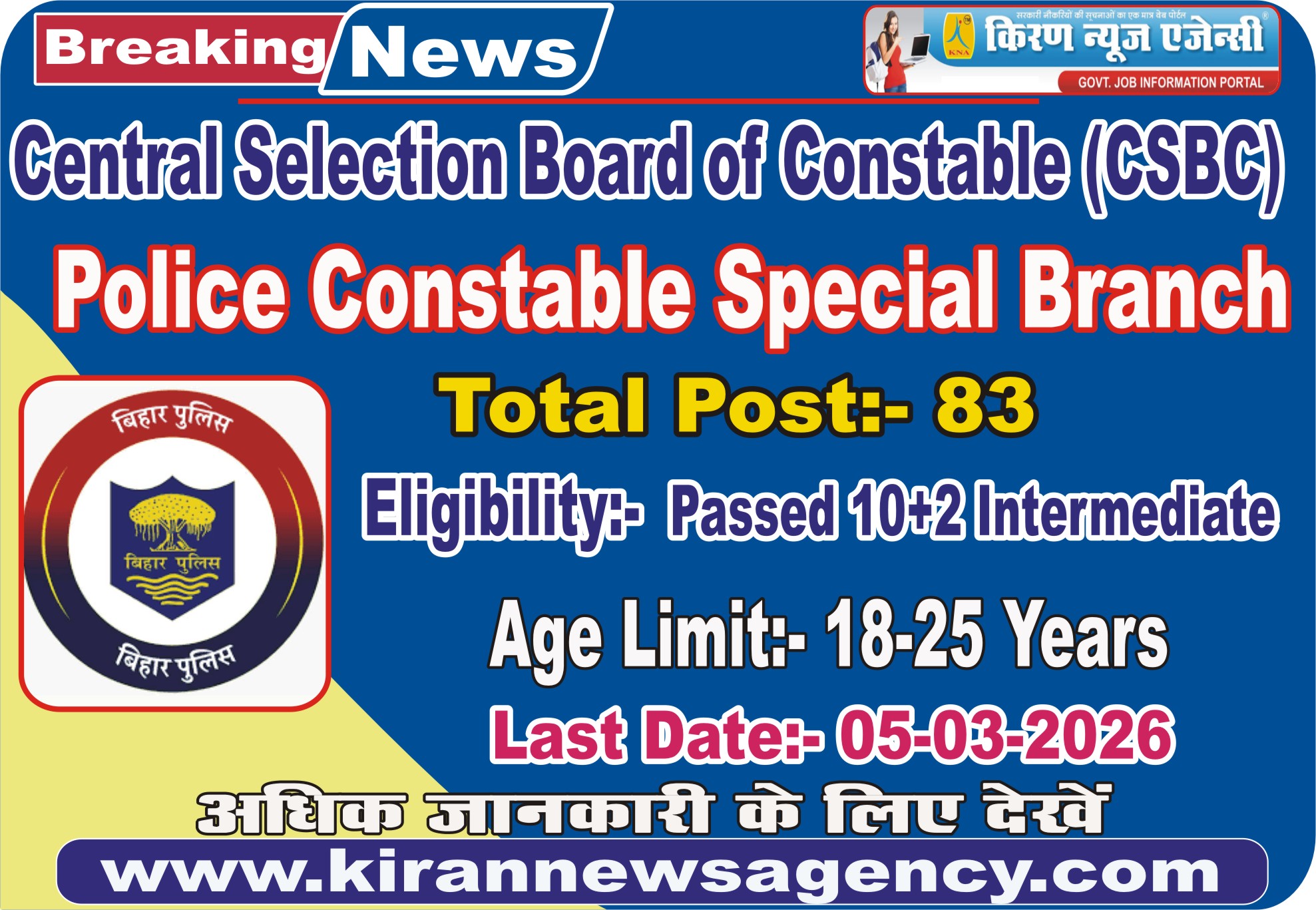 CSBC Bihar Constable Special Branch Exam 2026 : Vacancy Details Total : 83 Post |
