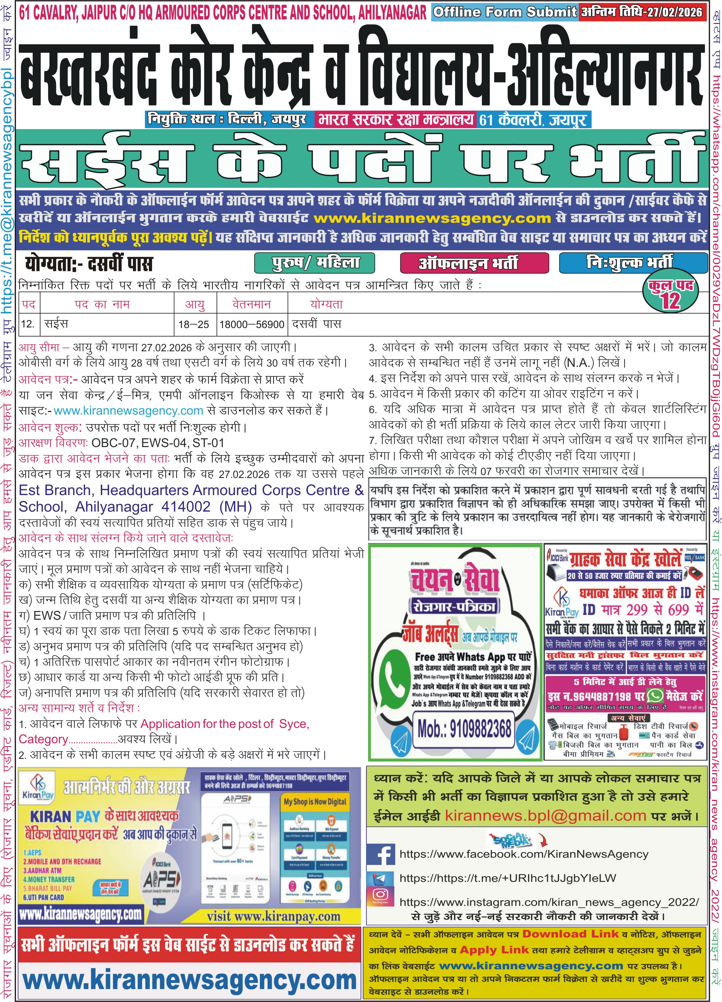 Indian Air Force Gwalior MP (Agniveer)   |    Indian Air Force Agra (Agniveer)   |    Indian Air Force Bareli (Agniveer)   |    Indian Air Force Barmer(Agniveer)   |    Indian Air Force Bikaner (Agniveer)   |    Indian Air Force Chandigarh (Agniveer)   |    Indian Air Force Gandhinagar (Agniveer)   |    Indian Air Force Gurugram (Agniveer)   |    Indian Air Force Jaipur (Agniveer)   |    Indian Air Force Jaisalmer (Agniveer)   |    Indian Air Force Jodhpur (Agniveer)   |    Indian Air Force Kanpur (Agniveer)   |    Indian Air Force Mumbai (Agniveer)   |    Indian Air Force New Delhi (Agniveer)   |    Indian Air Force Puna (Agniveer)   |    Armoured Corps Centre & School Ahilya Nagar [71 Ca   |    7010 EME Bn, Bathinda Cantt   |    7002 EME Bn, Ambala   |    Air Force School, Gwalior   |    Jila Satra Nyayalaya Gurugram   |    ECHS Prayagraj   |    District & Sessions Court, Jhajjar   |    District & Sessions Court, Narnaul   |    District & Sessions Court, Sirsa   |    District & Sessions Court, Sonipat   |    ECHS Agra   |    ECHS Bikaner   |    ECHS Dehradun   |    ECHS Hindon, Ghaziabad   |    ECHS Meerut   |    MP Shri KV Khandwa MP   |    UPSC Civil Services IAS Pre    |    MP Apex Bank Computer Operator & Society Manager L   |    MP Apex Bank Officer Grade 1 & 2 Last Date Extende   |    MPESB MP Police ASI, HC Computer    |    Rajasthan RSSB Women Supervisor   |    Bihar Police BPSSC ASI Operation   |    Yantra India Ltd YIL Ordnance Factory    |    Delhi High Court Junior Judicial Assistant (JJA)   |    CSBC Bihar Police Constable Special Branch    |    BSNL Senior Executive Trainee SET   |    Bihar BPSC Auditor under Panchayati Raj Dept.   |    Indian Navy SSC Officers    |    Rajasthan RSSB Lab Assistant   |    Bihar Police BPSSC Sub Inspector Prohibition   |    BECIL Bangalore   |    ECHS Bhopal   |