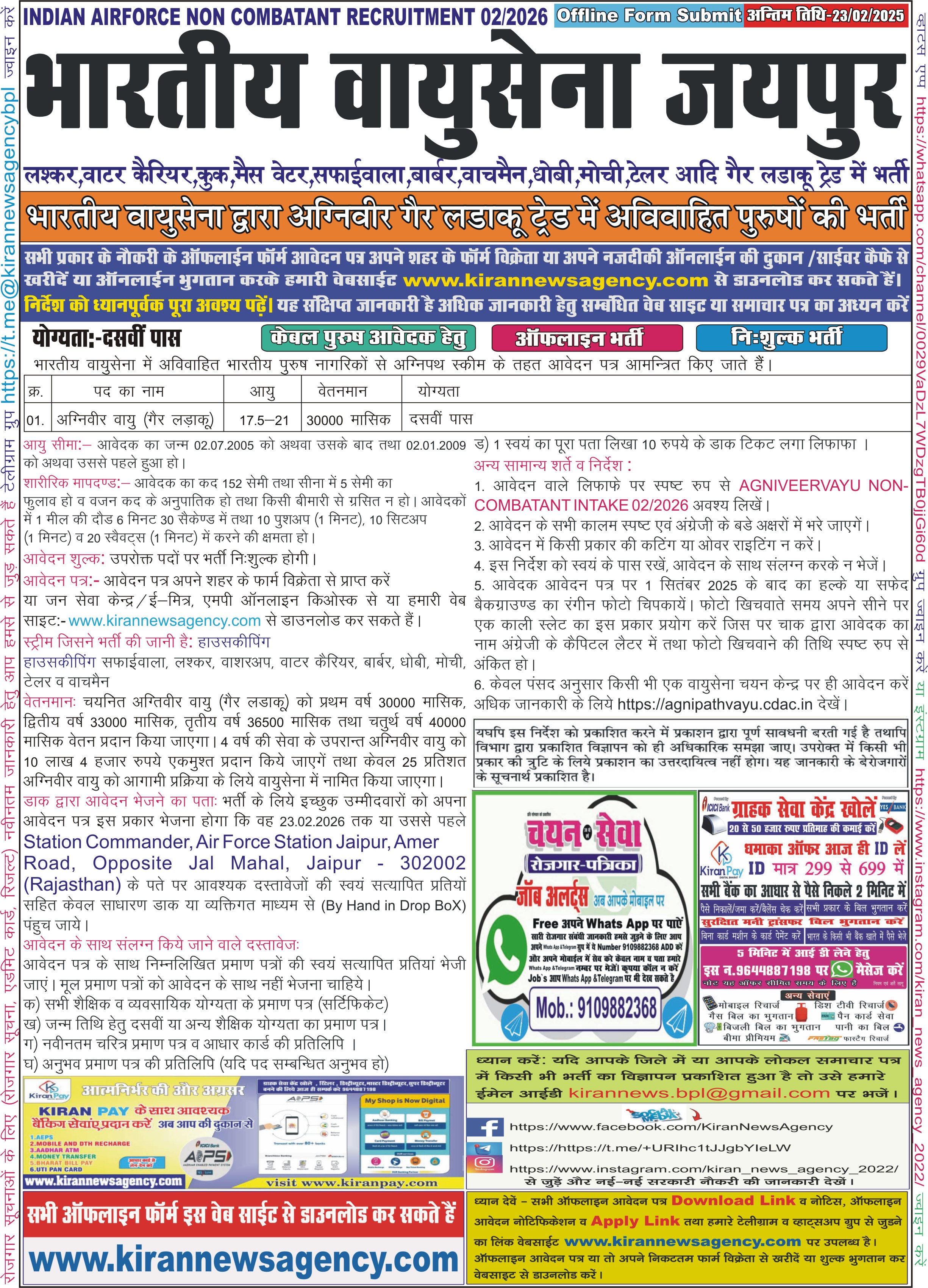 Recruitment :-Agniveer Vayu Non Combatant 02/2026